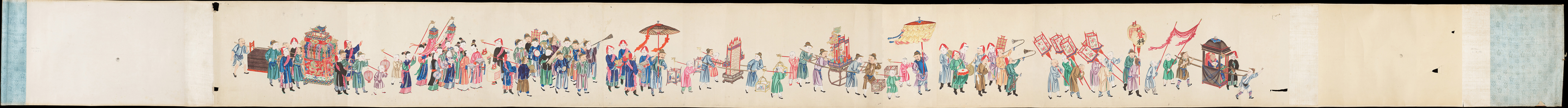 此图作者不详,描绘清代官员家庭婚礼的送亲环节。其风格类似外销画。从卷轴卷轴人物手持的灯笼上可以看到「文武世家」字样。画心装裱在白色纸上。锦包首为粉色丝织物,伴有蓝,红,黄三色几何图案纹。