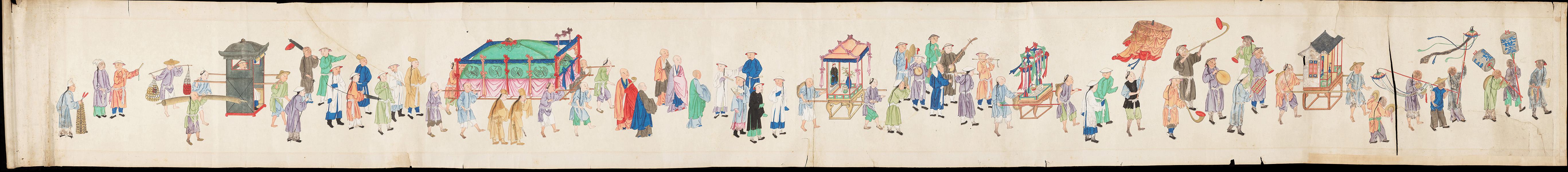 画卷分别描绘清代官绅家丧礼、送葬场景。其中包含火把引路、过桥仪式、乐队开路,和尚念经、灵柩起运等环节。画卷绘制风格应属于清末外销画。旧时丧葬通常经过沐浴更寿衣、上厅、报庙、发讣告、置灵堂、成服赐杖、接棺、入殓、吊祭、守灵、出殡、安葬、回灵、超度、升龛等环节。