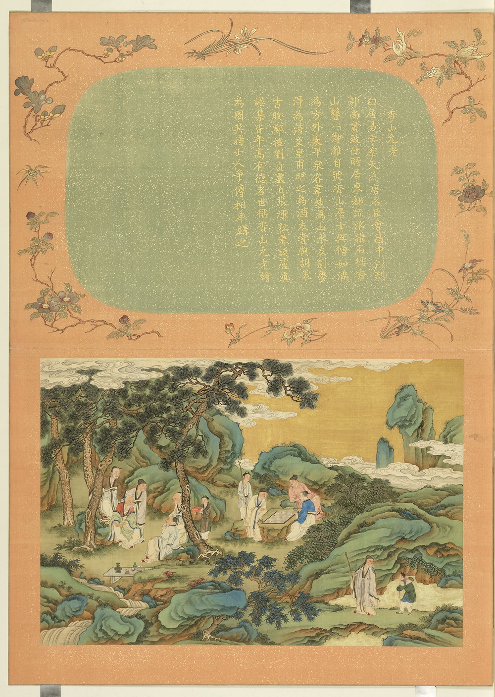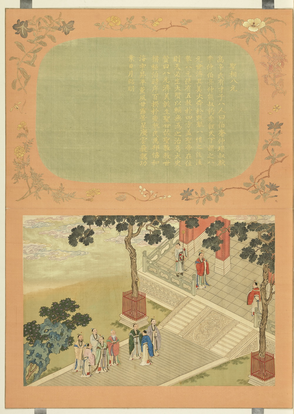清宫廷画师为向皇帝献寿而作。描绘十二个祥瑞故事:瑶池春宴、圣相八元、香山九老、贞元七贤、父子状元、五老朝元、翰林五凤、耆英胜会、虎溪三笑、焚香告天、进献瑞木、蟠桃宴会。