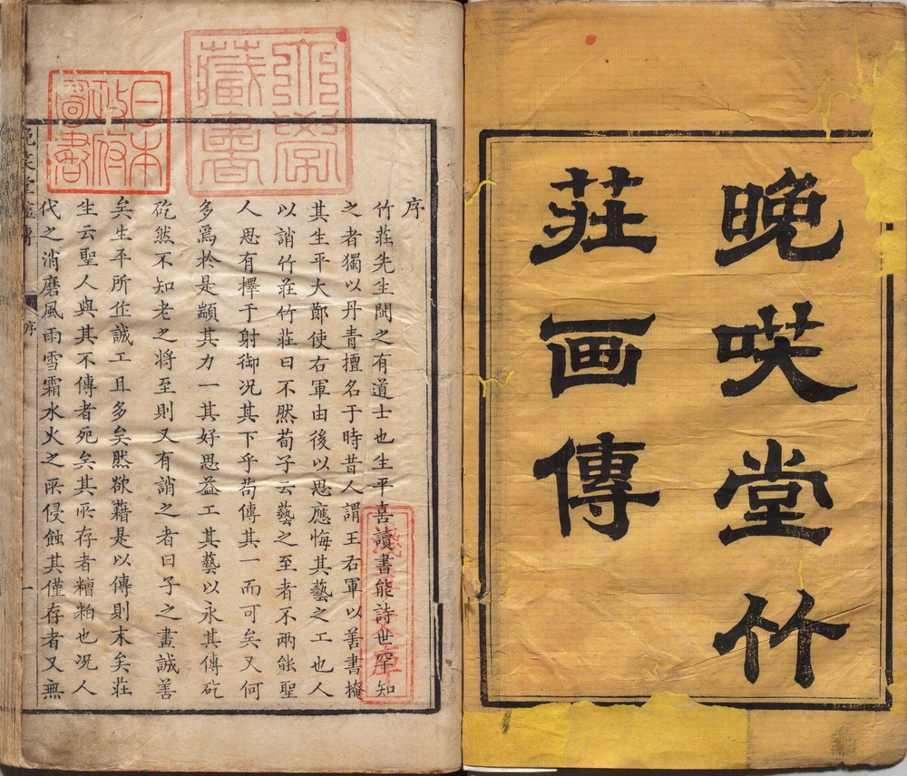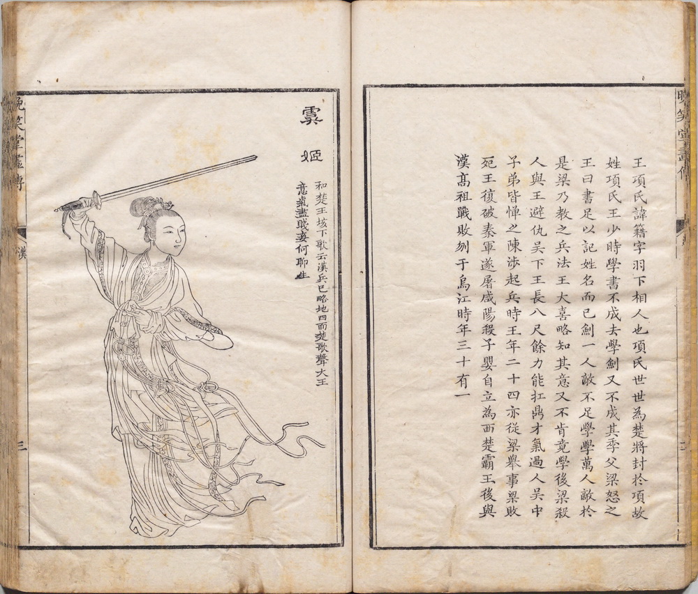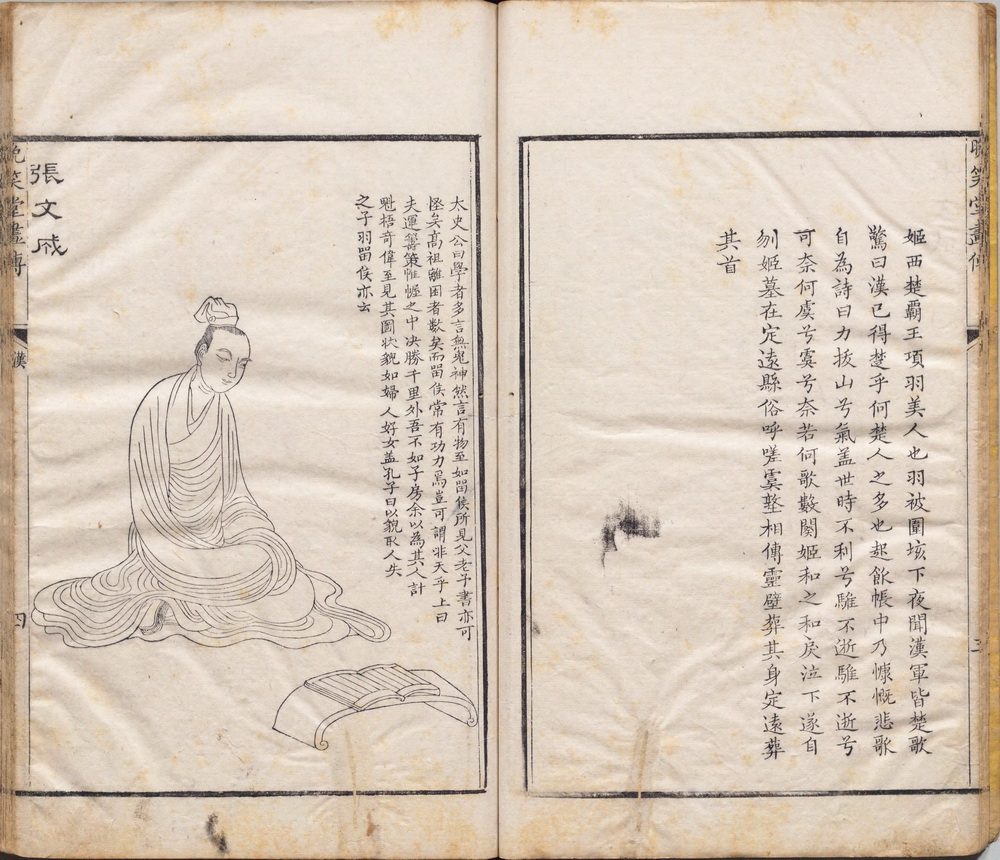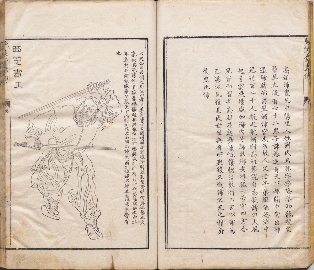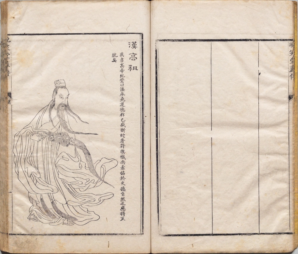 《晚笑堂竹庄画传》为清代画家上官周晚年创作的古代名人画像集。全书共三册(含《明太祖功臣图》一册),收录历代圣贤、名臣、名将、名媛之像(从西汉刘邦至明初郭德成共一百二十人画像)每人一图一传,绣像中用隶书注明人物并附有楷书赞颂,次页为人物小传。