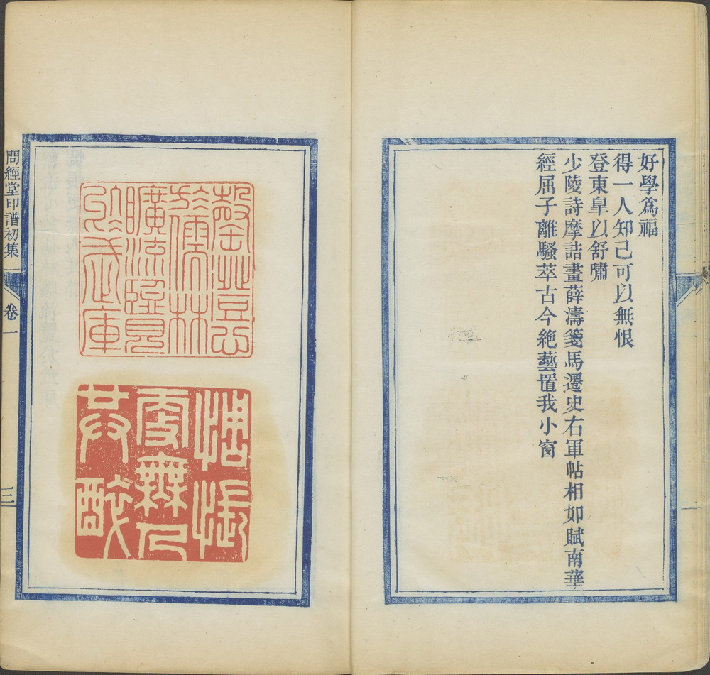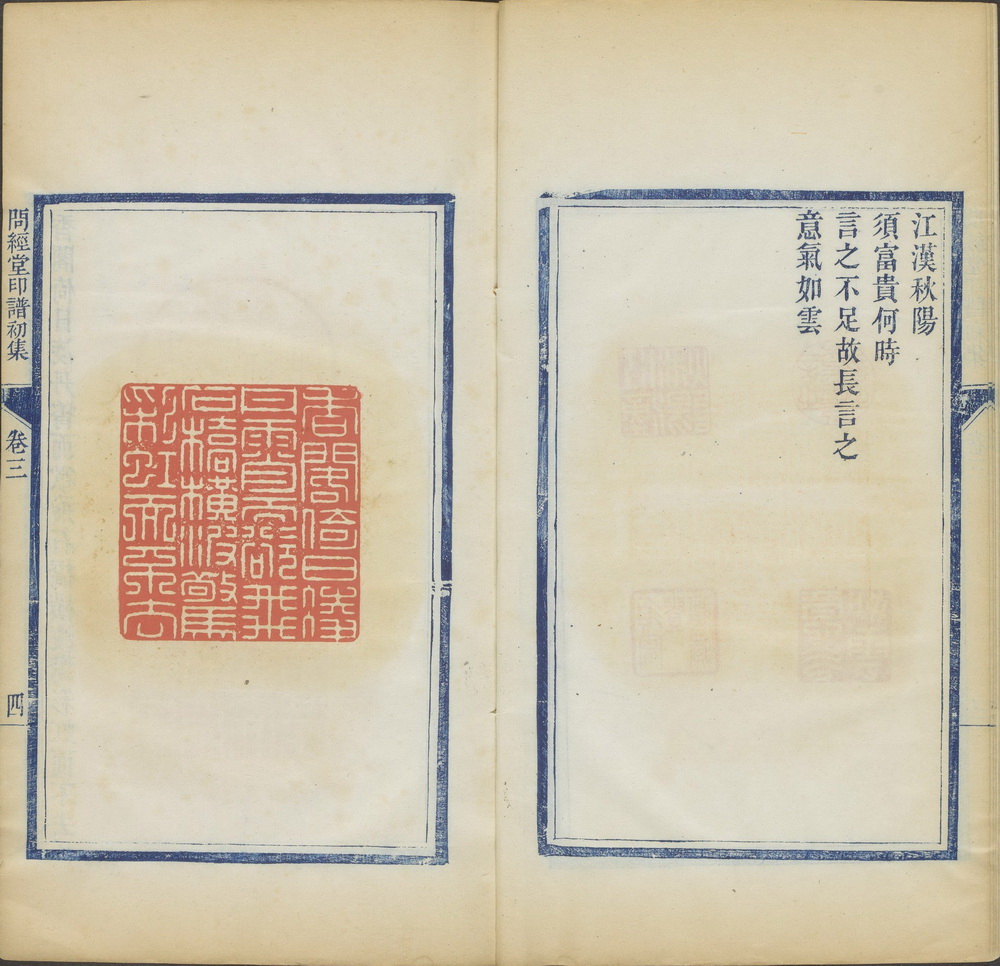 《问经堂印谱》由清代篆刻家包桂生辑录自藏印而成。全书共三集,每集分四卷,每页钤印一方至四方。初集录印三百一十四方; 二集录印二百九十七方; 三集录印三百二十四方。总计有九百三十五方印, 每印均注有释文。