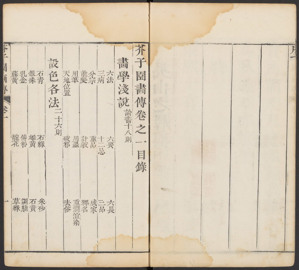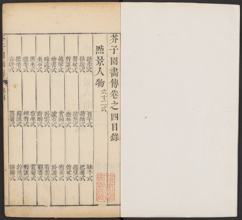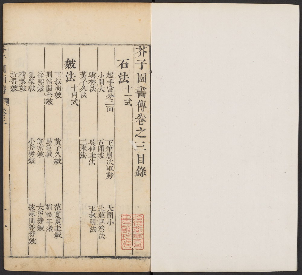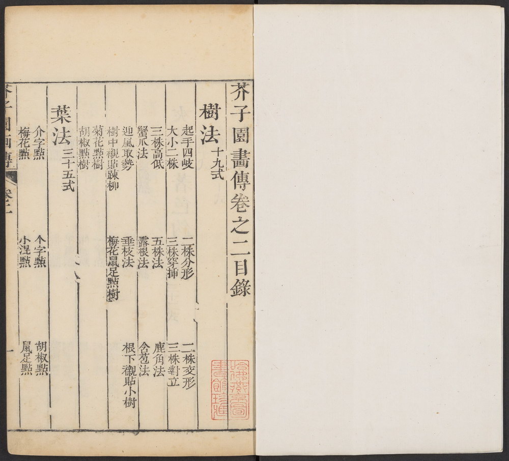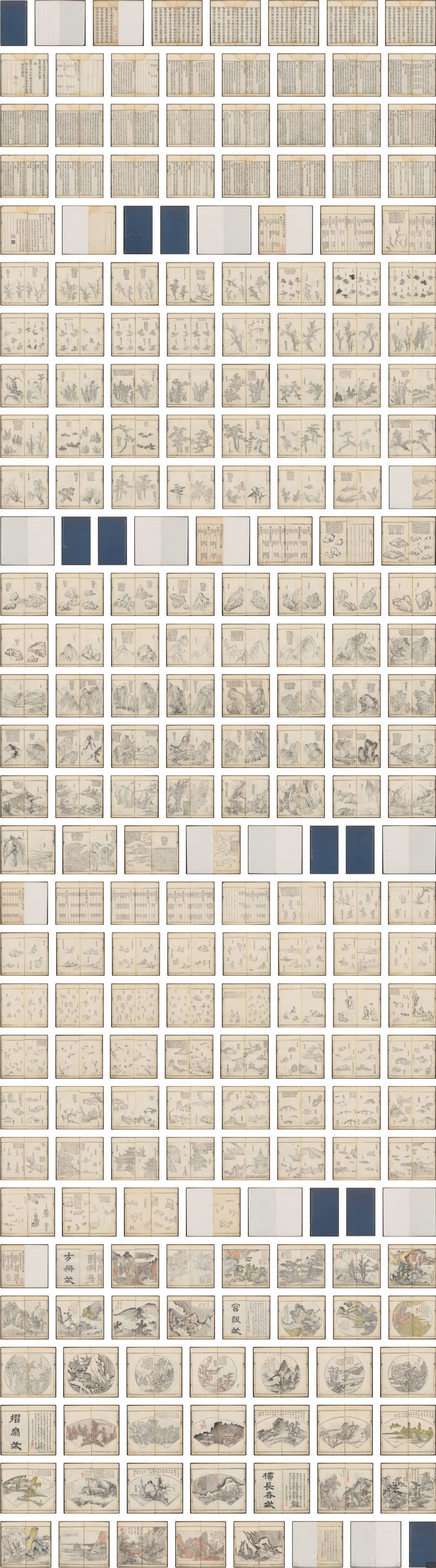 此内含青在堂画学浅说、树谱、山石谱、人物屋宇谱、摹彷诸家画谱,有”芥子園珍藏”, “王暬臣之”, “孟樵”, “即此是學”等印记。