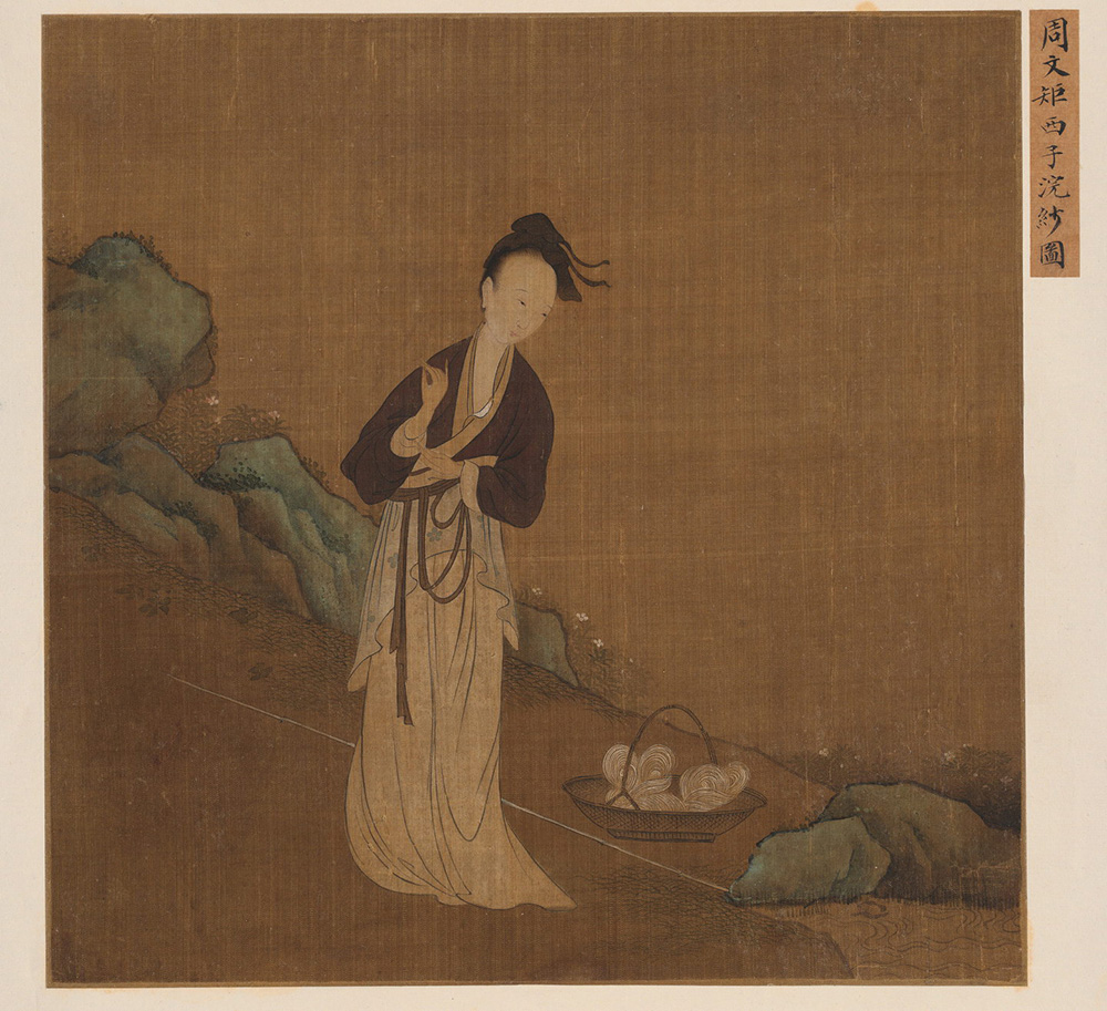 此图旧签题作者为五代周文矩,但实出自清人之手。西施之名最早见于《尸子》《管子》等文献,其中多叙述其美貌及捧心典故。东汉赵晔所著《吴越春秋》记载了西施与勾践破吴的历史。至晋人孔晔撰《会稽记》,则将她与浣纱相连。