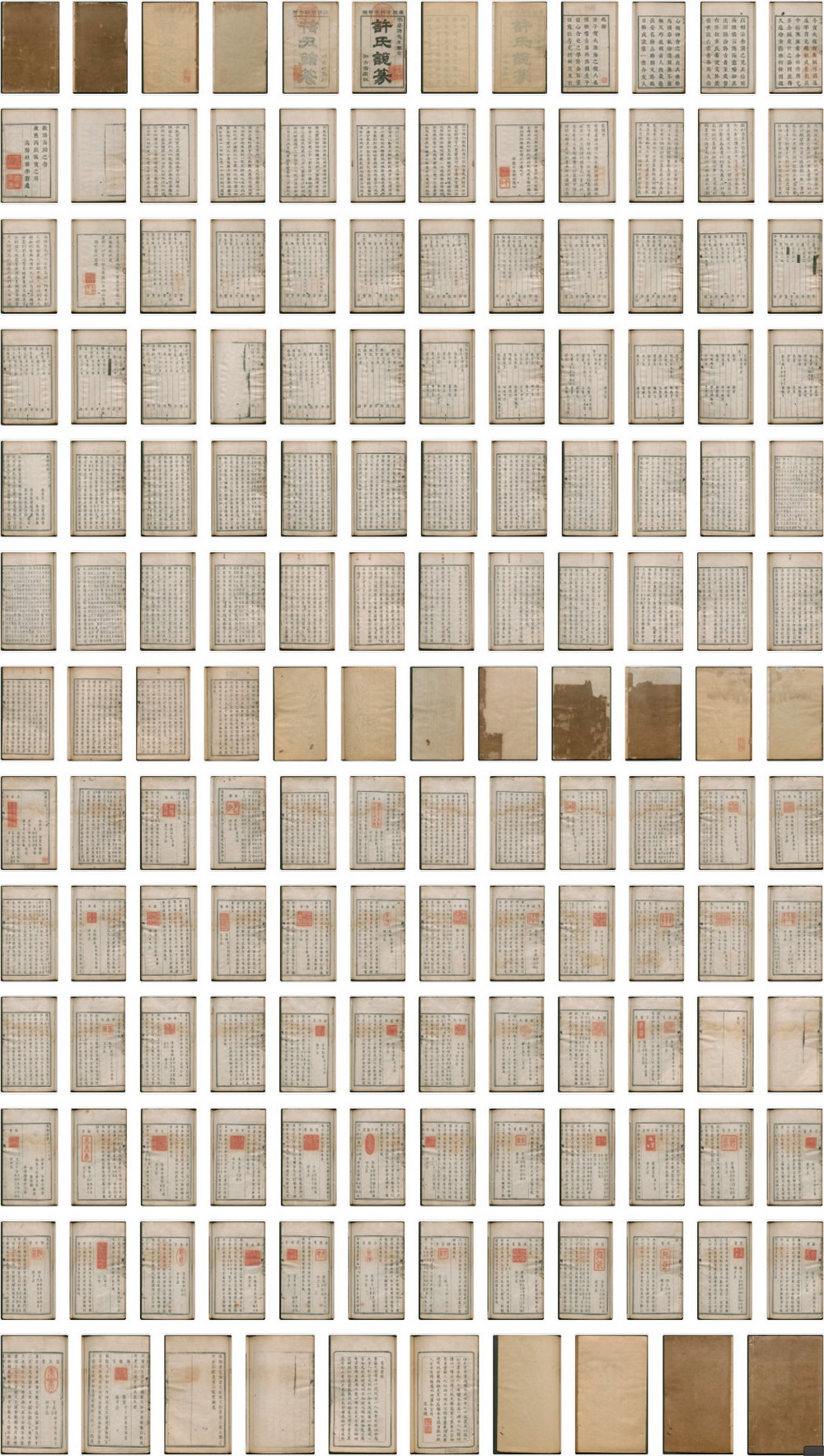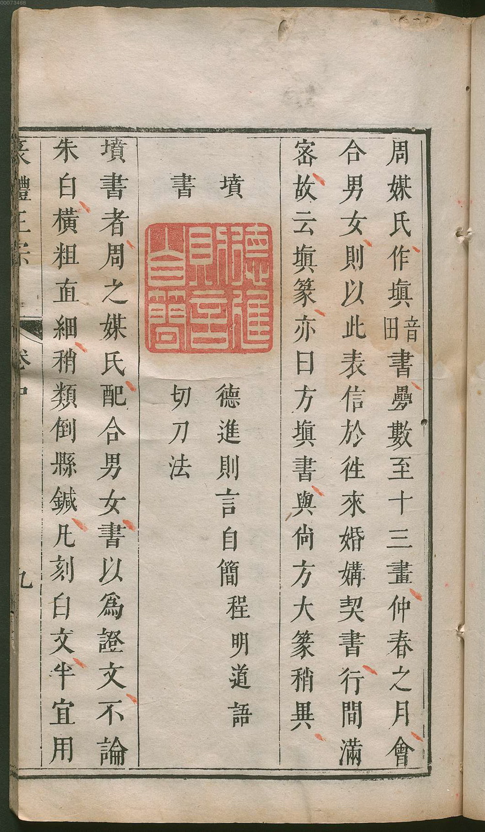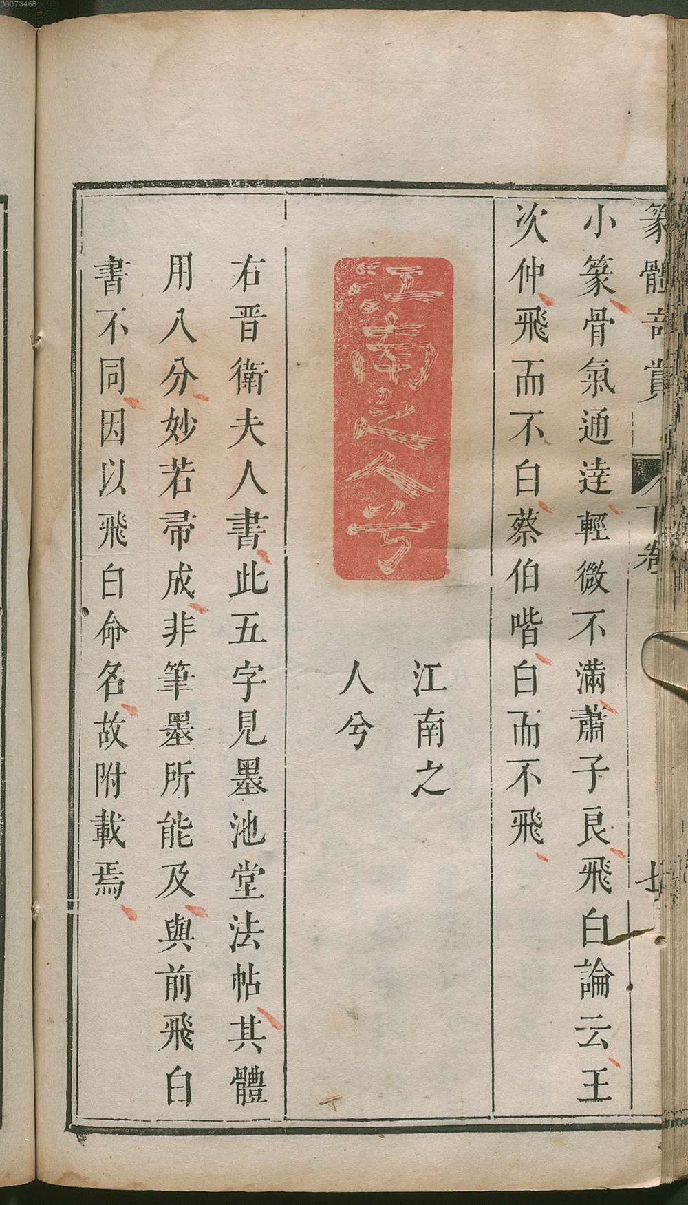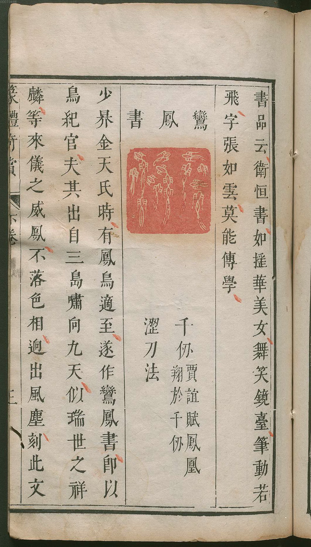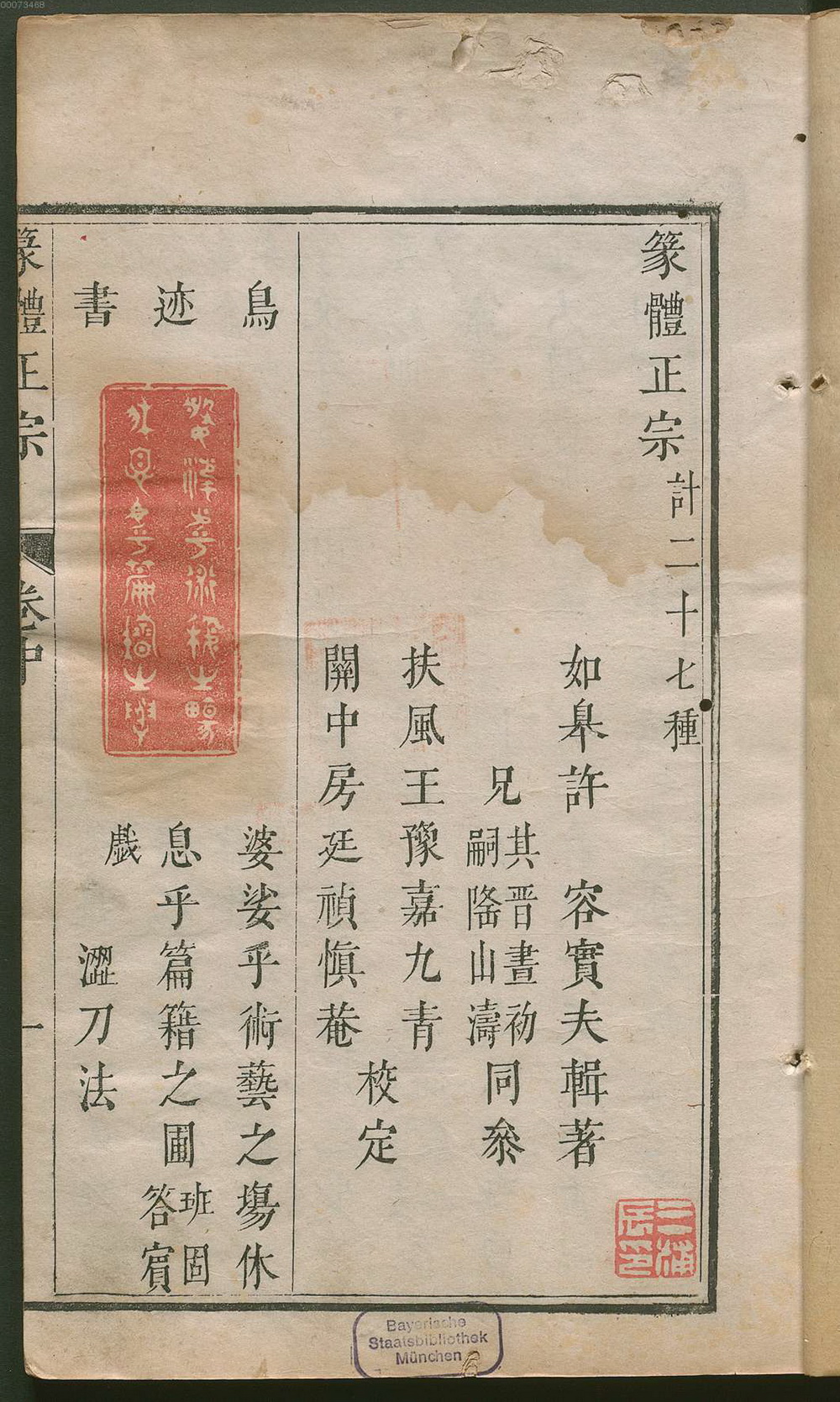 《许氏说篆》为东皋印派的开创人许容编撰。本书分上中下三卷。卷上为篆体原始,计12则;卷中为篆体正宗,计27种;卷下为篆体奇赏,计27种。卷中及卷下,每种字体均有原钤印拓示范书体,下并注有用刀法。扉页署“许氏说篆”,旁註“师古斋藏板”。有李霨、许自俊、许孙荃序文,及赠言目录。此本上卷版心上镌” 篆體原始 “, 中卷版心上镌” 篆體正宗 “, 下卷版心上镌” 篆體奇賞 “;版心中镌卷次; 行间镌朱笔评点;封面镌” 康熙十四年新鐫,燕臺諸先生鑑定, 許氏說篆, 師古齋藏板 “; 卷端题” 如臬許容實夫輯著 “;钤有” 三浦文庫, 鑑賞同好, 郢正大方, 三浦辰印, 李霨之印, 青宮太傅 “印。