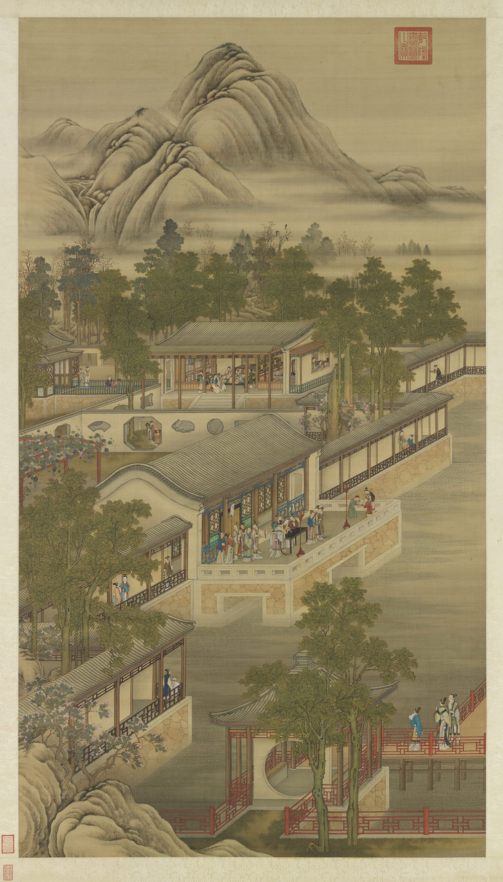 七月:七月初七,俗称乞巧节,大体说来,对闺中妇女的意义比较浓。画幅里的闺中妇女,正设立香案,对月乞巧,细细的好像能听到祝祷的声音。男士们却比较闲散,在敞轩中吹弹作乐。山林里面一片森森夜气,有一两只喜鹊停栖着。在民间传说中,说是牵牛织女,每年只有在七夕见一次面,而渡过银河之时,是由无数的鹊群,首尾相衔,连成的 “鹊桥” 接引。画中的喜鹊,并不完全是为了点景。《十二月月令图》全套共十二幅,描写岁时,也就是一年自农历正月到十二月间,民间各种节令与习俗的风俗画。此套图轴可能由清乾隆初年宫廷画家合作完成,曾经在乾隆时期宫廷里悬挂,每月一幅。