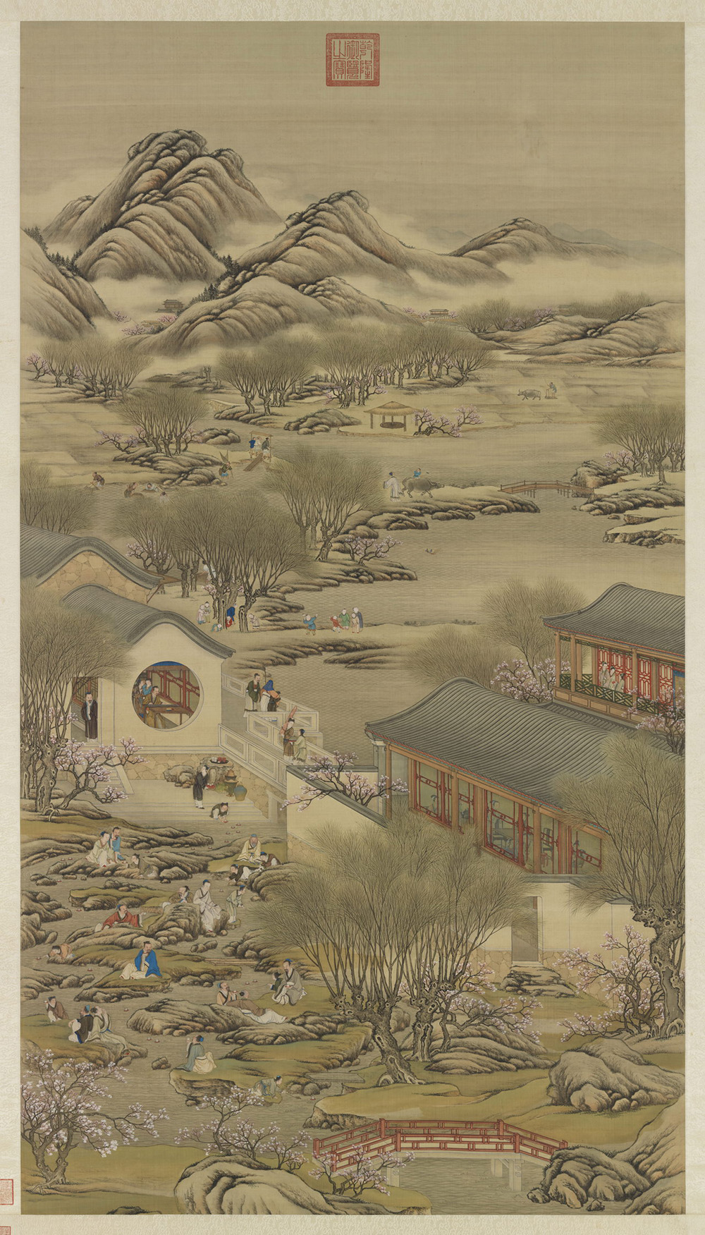 三月:农历三月,正是赏受户外生活最好的季节。图中画着是上巳修禊的故事。文士们坐在小河沟的旁边,童子们把「羽觴」斟满了酒,从水的上流漂浮而下,想喝酒的人就把羽觞取来。上巳,是三月初三。修禊,是袚除不祥。羽觞,是在水上能漂浮的酒杯。在汉朝时,人们就有到水边袚除不祥的风俗。到了晋朝,有名的书家王羲之,在山阴兰亭浮觞咏诗,因此上巳修禊,便成为有名的故事。《十二月月令图》全套共十二幅,描写岁时,也就是一年自农历正月到十二月间,民间各种节令与习俗的风俗画。此套图轴可能由清乾隆初年宫廷画家合作完成,曾经在乾隆时期宫廷里悬挂,每月一幅。