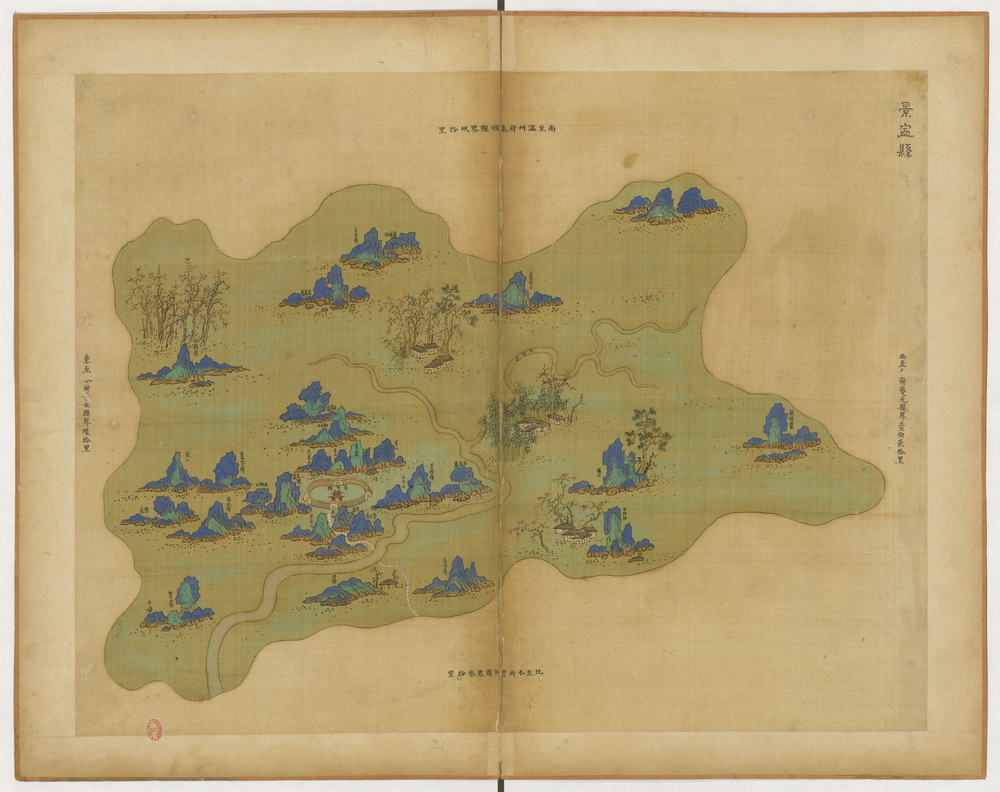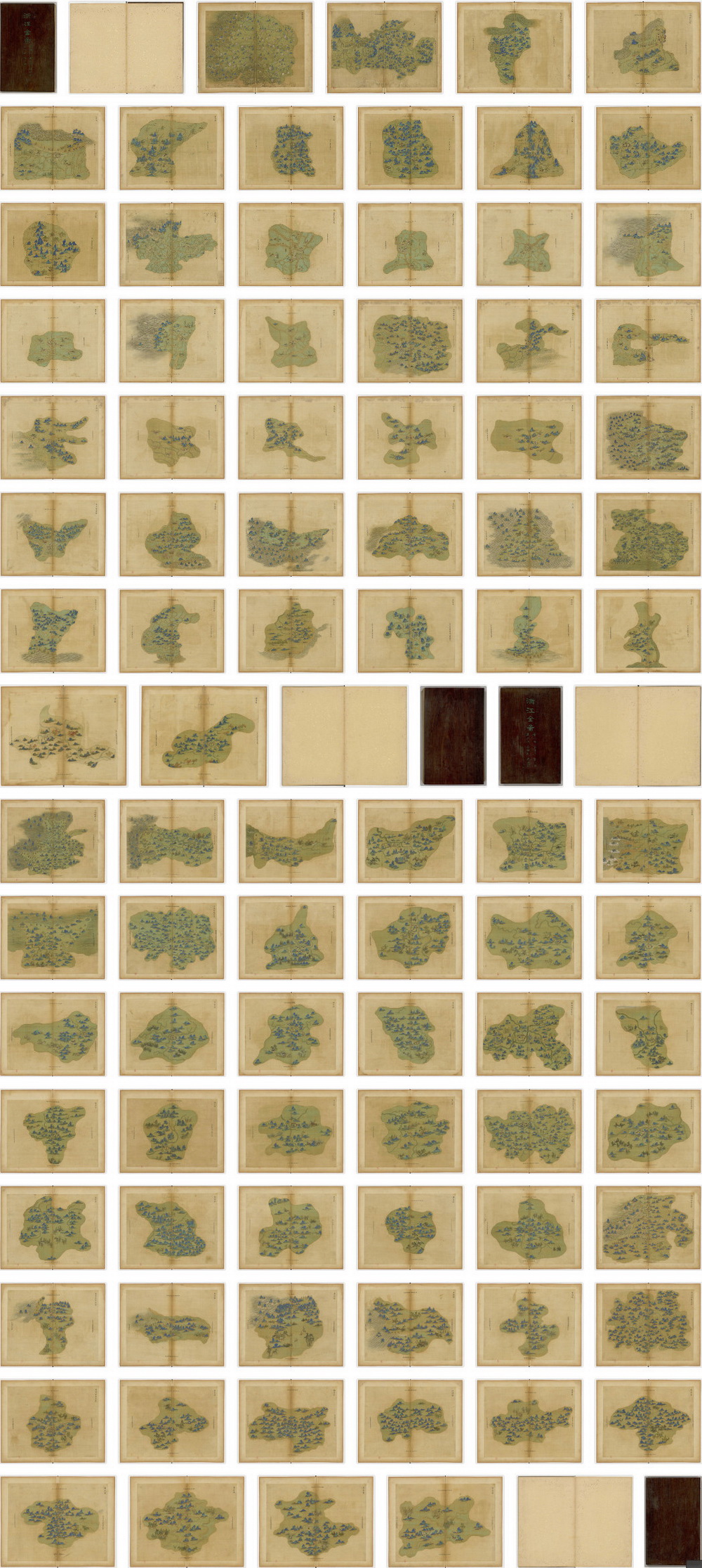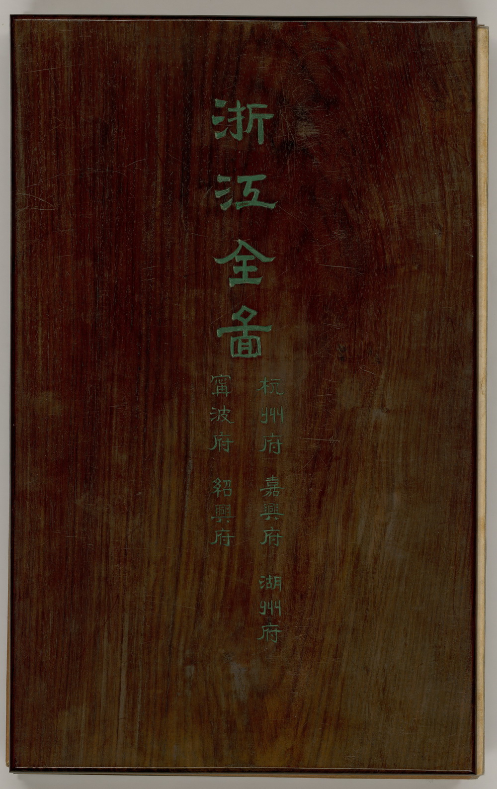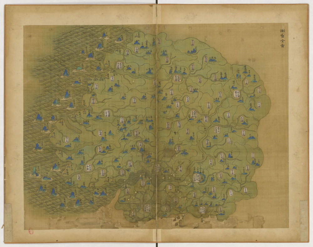 《浙江全图》其作者不详。全套共两册,共含青绿山水地图八十八幅,描绘清代浙江省全图及州县地图(全图、杭州、嘉兴、湖州、宁波、绍兴、台州、金华、衢州、严州、温州、处州府等),标记境内:山脉、河流、湖泊、府衙、海岸、岛屿等,四边有位置距离标记及地图名。(法国图注:1661至1686年之间)