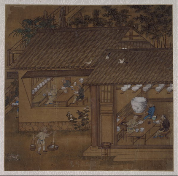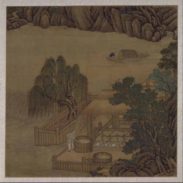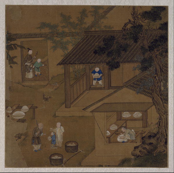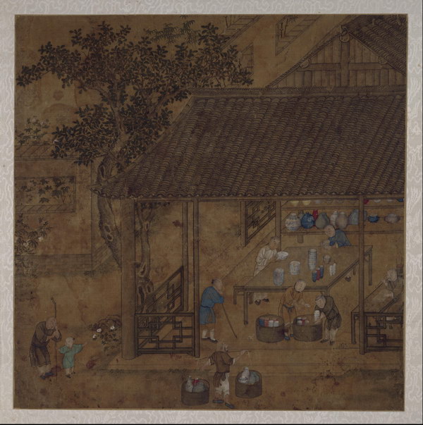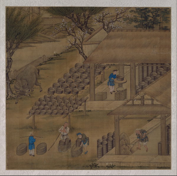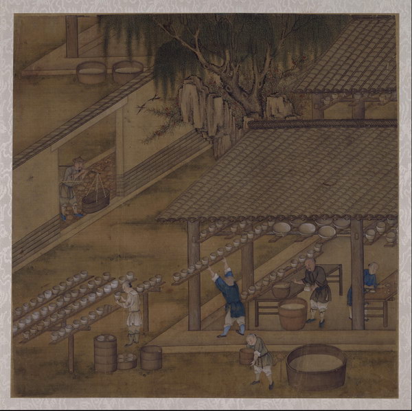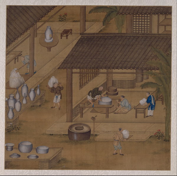 此册8开,绘古代烧造瓷器的主要过程,包括练泥、拉坯、晒坯、刻花、施釉等,清晰地再现了瓷器烧造技艺工序。图中人物造型准确,界画清晰工稳,具有宫廷绘画特点。