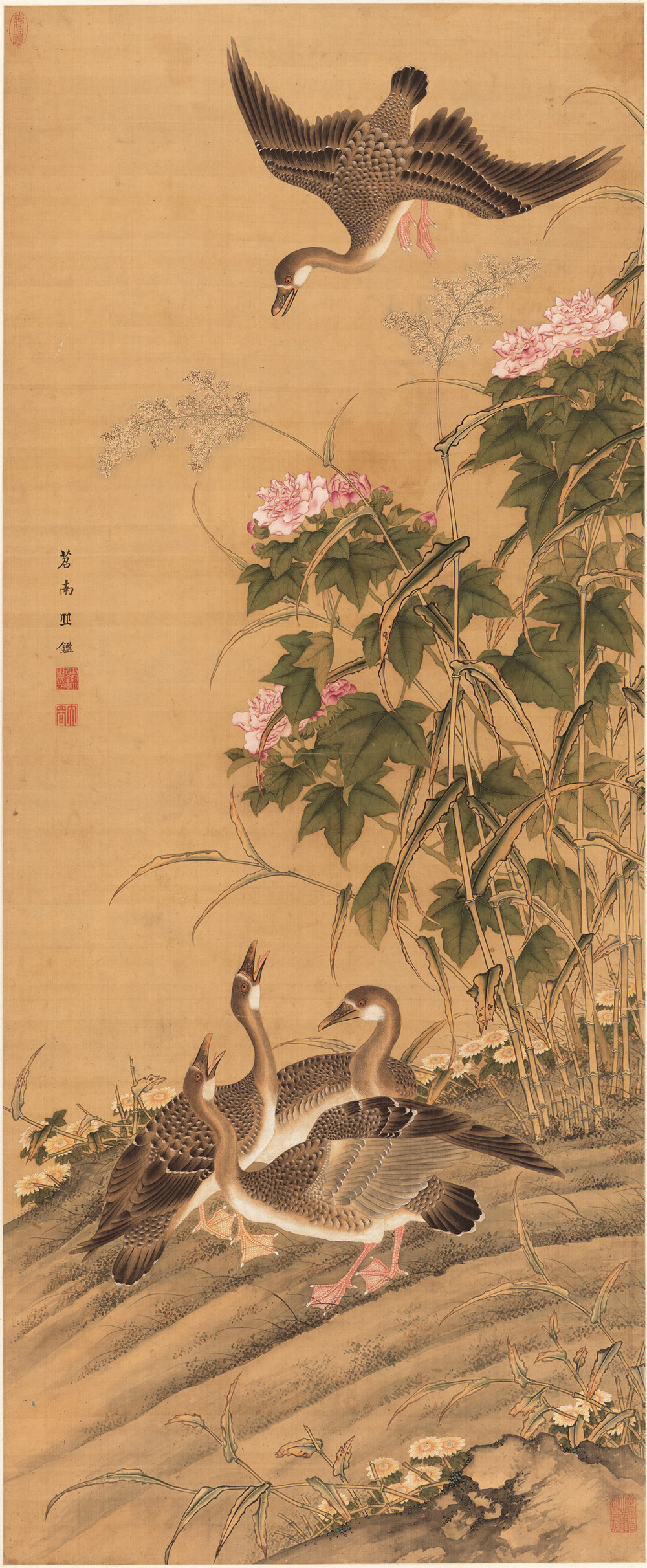 图绘坡地上芦雁三只,正抬头呼唤着空的另一只,另一只张开的嘴正急急回应着,芦雁羽毛丰满,体型健硕;右侧的芙蓉、芦苇、雏菊蓬勃绽放,花红叶绿,色彩艳丽。此幅是丘鉴传世孤本,从画风看似出自沈铨一派。