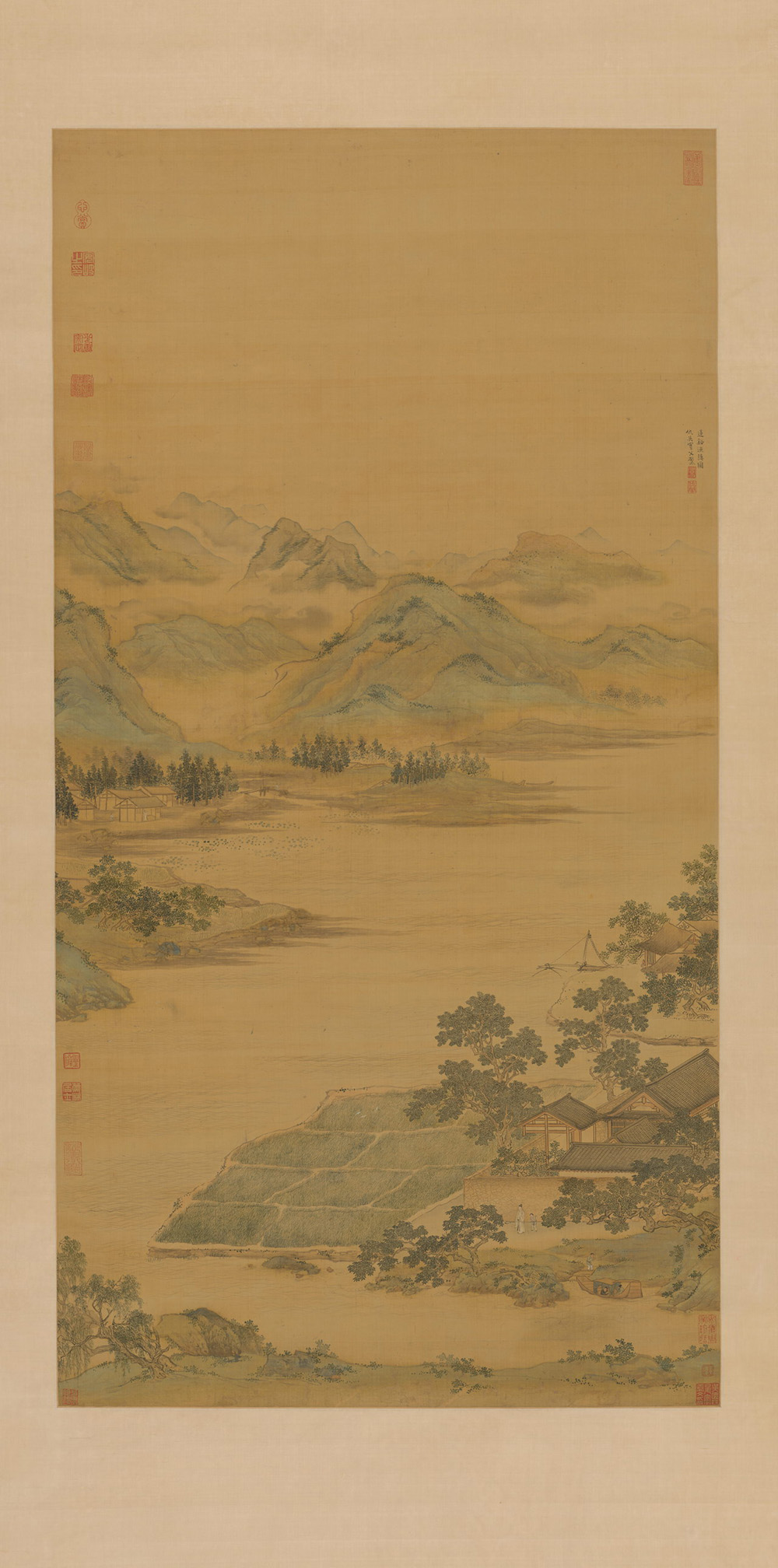 此图写江南水乡景色,平远山水。画清溪水田,绿树成荫,岸边一院落,院外有高士携书童远眺,悠然自得,远处云山起伏,真实地再现了江南渔村恬静安乐的生活情景。布景清远疏旷,笔法工整而有潇洒之趣。图未署年款,从作品款识和绘画风格分析,应为画家晚年精品之作。曾为清代梁清标、安仪周、吴舜昇等人鉴藏。
