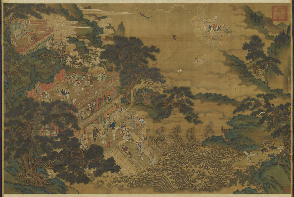 此作描绘主题应是群仙共赴蟠桃大会,为王母娘娘祝寿。陆、海、空诸景穿插层叠,构图工丽复杂;诸路神仙、瑞兽以此为舞台,现示各样神通。画面右下角小坡上骑著张果老驴子乱奔的李铁拐,元神已由葫芦中化成一道光束,回环飞至天际谒见太上老君。相对仙人简单的装束,画中楼阁器用装饰华美、结构繁缛。以金线细腻描绘的云龙纹样,在每根红色立柱上皆费心经营不同图案。本幅左下方有「實父仇英堇製」款,虽为托名之作,然精雕细造。