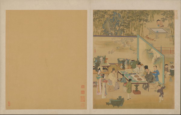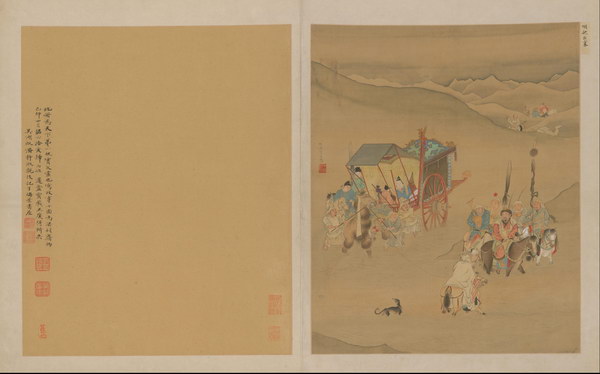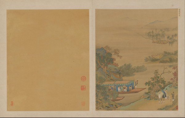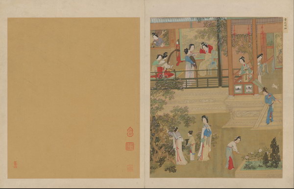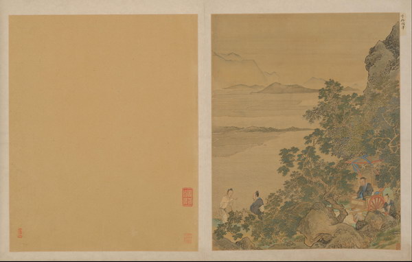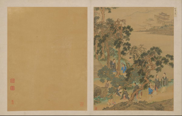 全册共十开,内容取材于历史故事、寓言传说、文人轶事和诗文寓意,具体为子路问津、明妃出塞、贵妃晓妆、南华秋水、吹箫引凤、高山流水、竹院品古、松林六逸、浔阳琵琶、捉柳花图等。这些题材历史上常被画家描绘,但仇英在作品立意、形象塑造和笔墨表现等方面,都注入了自己的才思和技巧,显示出鲜明的个性风格。