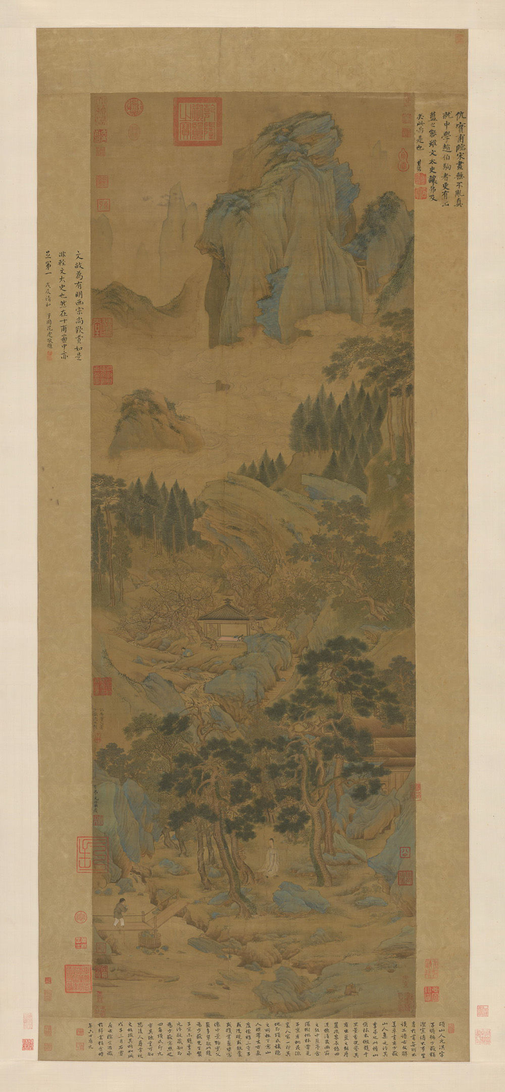 自题:“仇实父为少岳先生制”,钤“十洲”朱文葫芦形印。此图是仇英师承南宋二赵风格的作品,描绘的是幽深静逸的隐居环境。