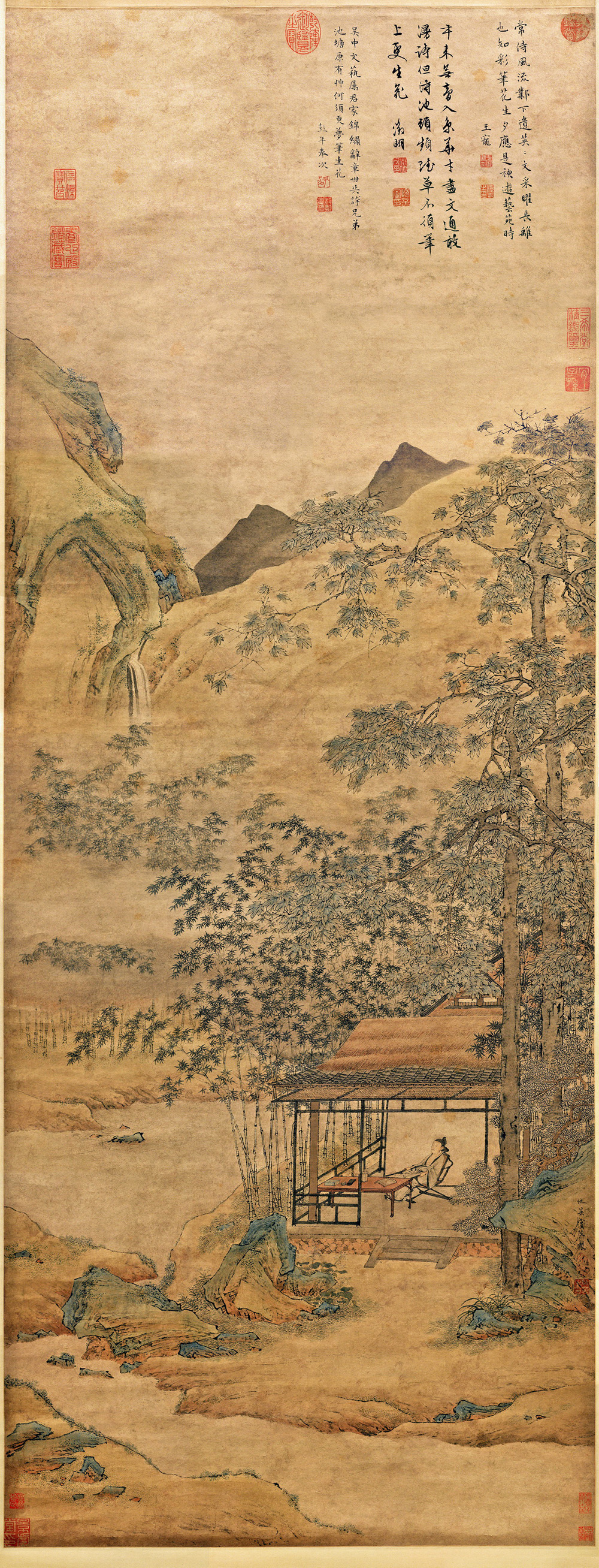 画一精舍,宽敞的书桌置于窗前,上置文具书籍,一士人半作半卧于躺椅上,神态安详。房舍四周修竹、梧桐摇曳生姿。坡石勾皴用拖泥带水法间乾笔皴擦,再以水墨淡淡晕染,颇见浑厚。上缀以萱花、丛菊,显示出隐居的悠雅情调。