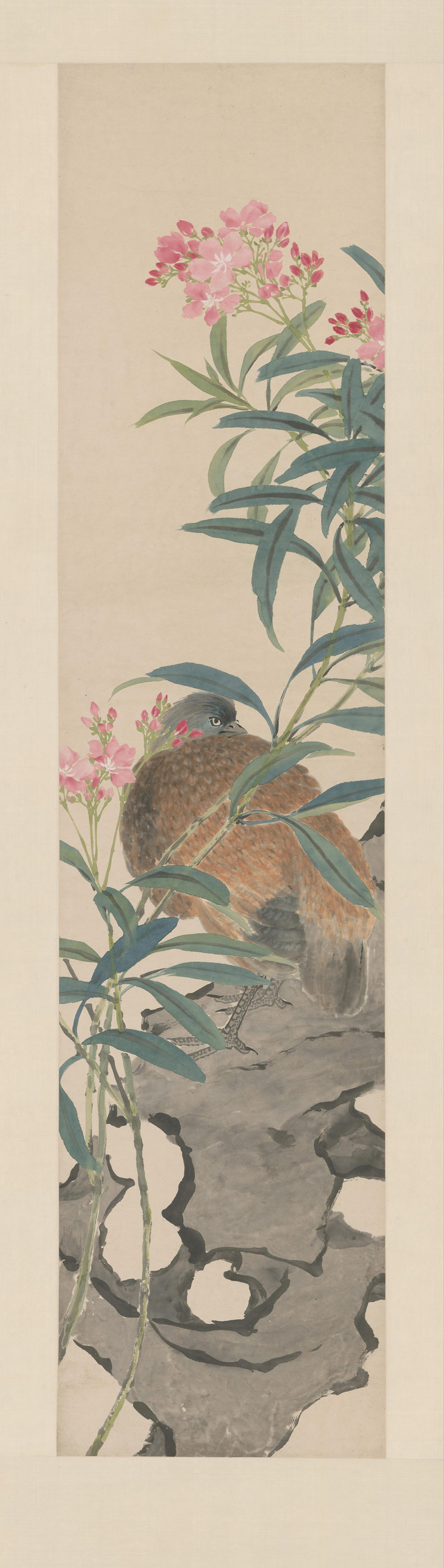 《夹竹桃鸡图》轴,作于清咸丰三年(1853年)画家33岁时,但已属其晚期作品。本幅上无作者款印。夹竹桃枝干秀丽挺拔,花朵盛开正艳,婀娜妩媚,一只山鸡悠闲地在山石上休憩,神态娴静。画面设色淡雅,花与鸡相得益彰。山石轮廓多用中锋,转折明显,墨色变化自然和谐。石面墨色浓淡不一,鸡羽则以大笔点染,夹竹桃花叶色彩鲜亮浓郁,使画面极富整体空间感和层次感。