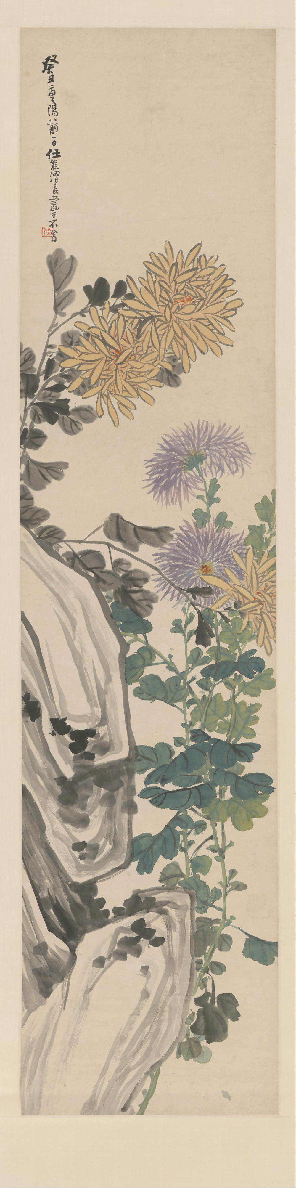 《菊石图》轴,本幅自识“癸丑重阳前一日任熊渭长画于不舍”,钤“渭长”朱方印。按“癸丑”为清咸丰三年(1853年),时年画家33岁。此画作于重阳节前一日,以秋色为背景表现了几方湖石与黄紫相间的数株菊花相依的情景。菊花花叶以水墨晕染、墨笔勾筋而成;湖石以淡墨大笔皴擦,浓墨点苔,表现出苍硬的质感。菊石相伴,刚柔相济。画面风貌雅致脱俗,石与花相映成趣,充分地表达了肃杀的秋意,而设色的花瓣却巧妙地调剂了画面的冷寂,黄与绿的色彩使人觉得神清气爽。