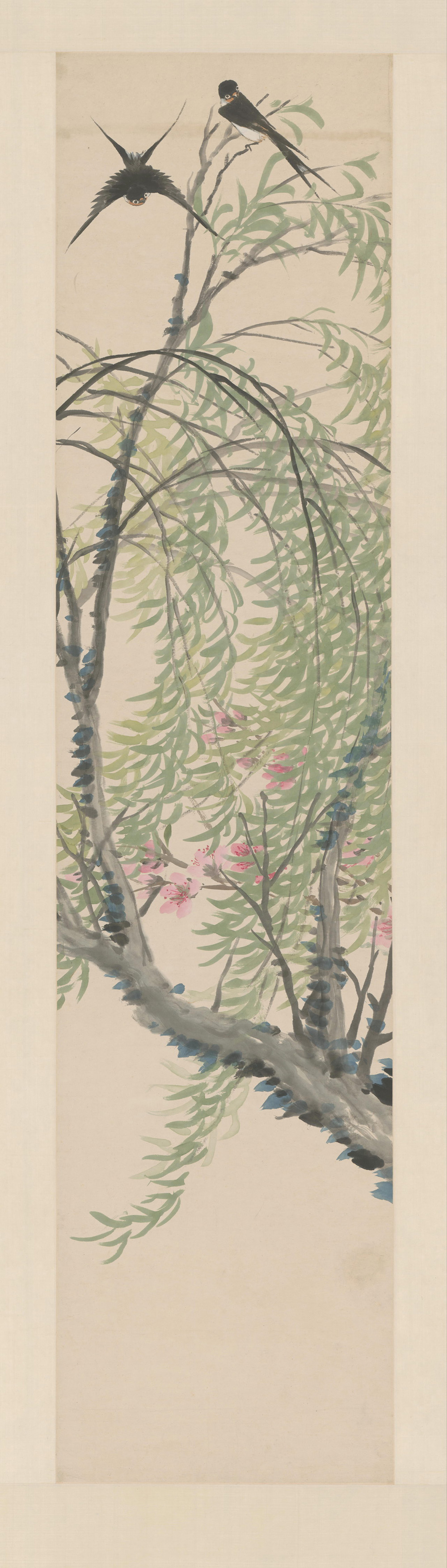 《桃柳双燕图》轴,本幅上无作者款印。杨柳青青随风摇曳,桃花几株隐现其中,枝头上两只燕子正欢快地嬉戏。画家巧妙地通过弯曲的柳条和燕子的上下飞舞增加了画面的动感,暗示出轻拂花柳的春风。画面风貌写实,设色明丽,色彩对比柔和,桃花在柳条间若隐若现,成为画面中最明丽的亮点,可见画家在色彩运用上的娴熟技艺。