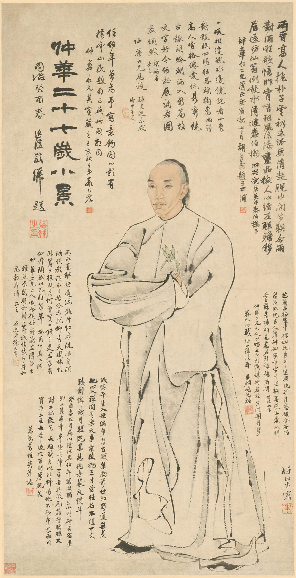 此图为淡设色绘制葛仲华全身立像。据德林隶书题“仲华二十七岁小景”可知像主当时的年纪。另据葛惟英自跋可知,葛氏是一名空有一腔抱负而不得志的落寞文人,所幸其“心入禅关有乐天”。人物面部施以淡赭色并略加晕染,色调稍有明暗对比,突出了人物面部的立体效果。主人公身着长衫,右手持淡青小花一支于胸前,神态淡定。衣纹以“钉头鼠尾”线描绘,刚柔相济,飘洒自如,富有节奏感,使得人物虽静如动。