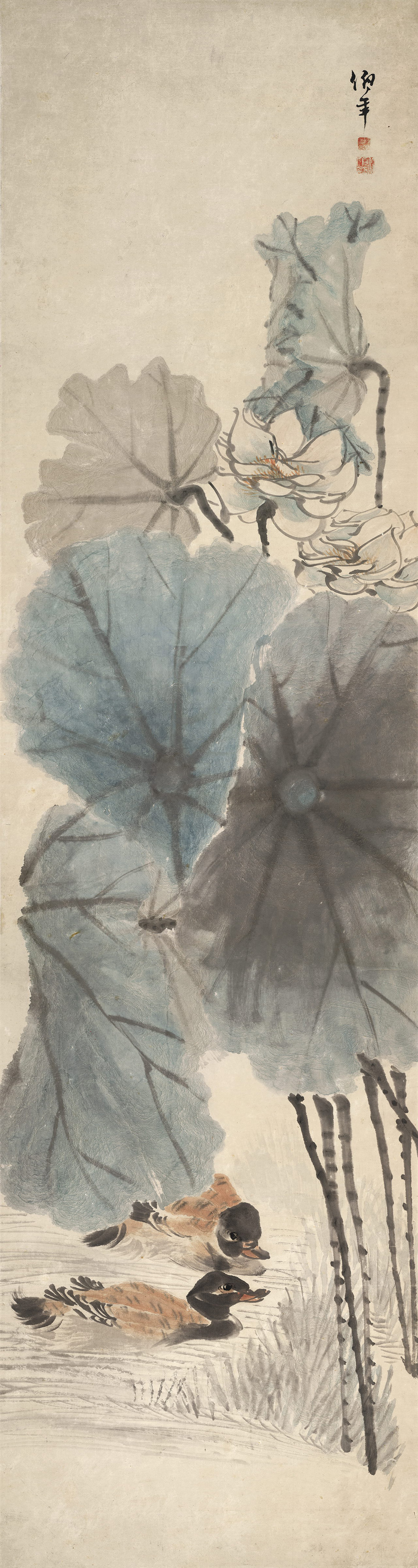 写鸳鸯游戏于荷田之中,荷叶硕大如盆,素雅的白莲花散发着幽香。画面以青绿色调为主,清新可人。因系画于熟绢之上,又以用水见长,故色彩交融明快自然,富于生气。笔与笔之间的留白,起到了透气和清醒视觉的作用,斑驳迷离,实非功力深至不能轻达此境。鸳鸯的造型古奥生动,运笔凌利,细节处收拾稳当,简练传神,均是彰显出任伯年独特而高超的绘画技艺之处。