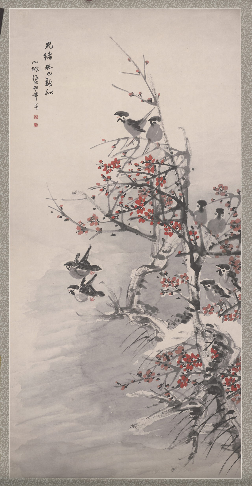 本图以右侧出枝式绘红梅若干,梅枝上白雪皑皑,可见冰棱挂起,而梅花依然朵艳丽苍劲;梅枝上6只麻雀,以一对对方式立于同一枝杆上,而另有两只呈飞翔状,似到远向觅食。此图动静相宜,寒冬中生机勃勃。