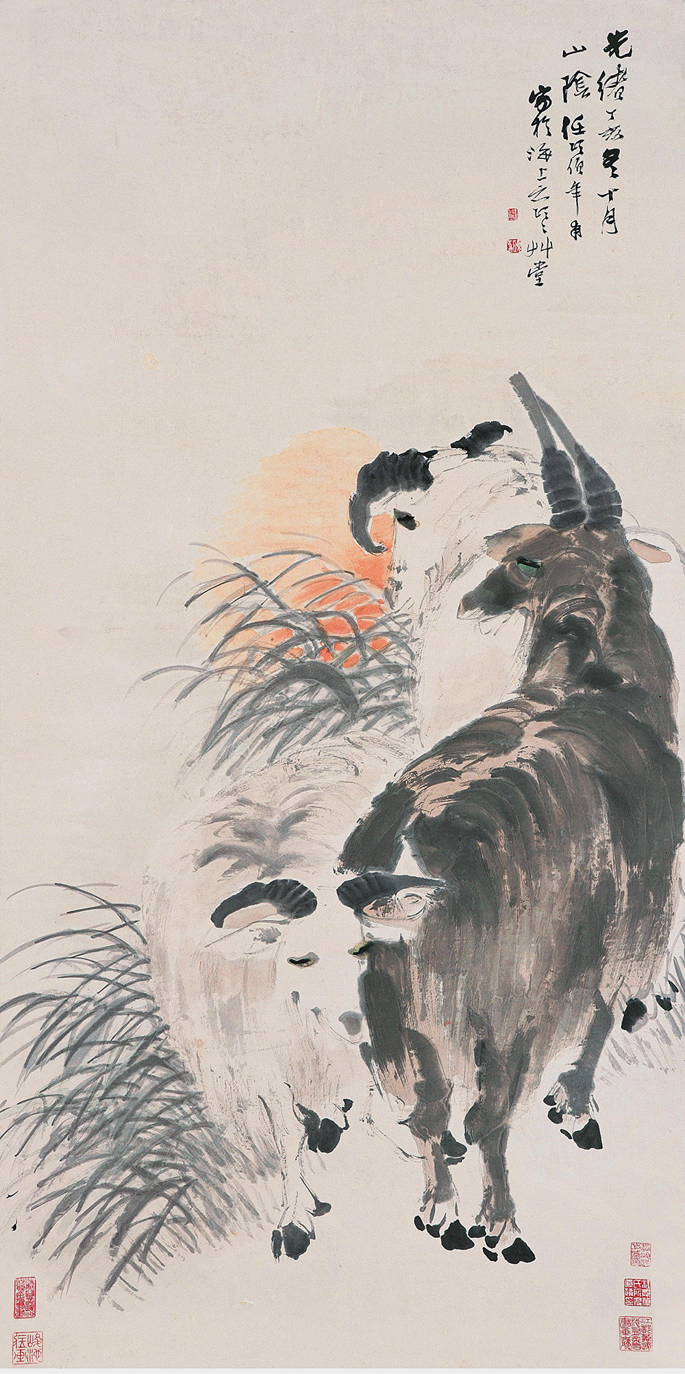 图绘一轮红日下,芦苇繁茂,三只羊儿似打圈似站立;二只白羊头顶黑色的羊角,弯曲可爱;一只黑色羊儿全身透黑,羊角尖锐。画上自题:光绪丁亥冬十月,山阴任颐伯年甫写于海上颐颐草堂。