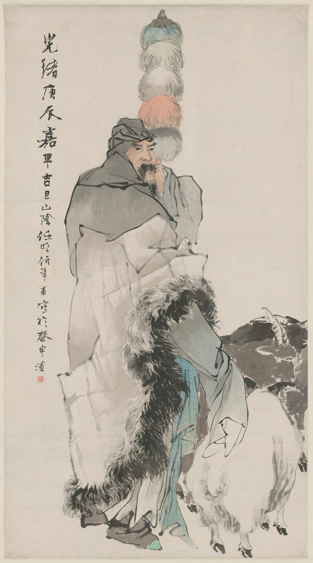 画中人物造型比例准确,除保持了陈洪绶人物奇古伟岸的特征之外,还融汇了西洋画速写、素描的技法,线条凝练概括,具有力度,与主题相统一。色墨的渲染协调统一,尤其是羊群运用写意的手法,在黑、白、灰的墨色变化中准确地描绘出羊群的造型,同时也描绘出群羊因寒冷而挤作一团的情景,以此衬托出环境的恶劣,从而突出了人物不畏艰难险阻的刚毅气节。