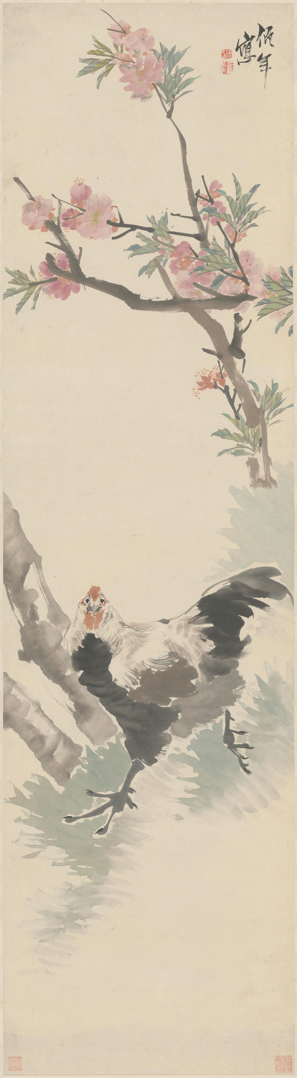 图绘雄鸡在桃树下奔跑的瞬间。任颐曾经学习过西方的素描,善于表现物象的形体结构,因此他能够娴熟地运用笔墨,生动地刻画出鸡跑动时警觉的神态和轻盈跳动的步伐。此图是其花鸟画中的精品之作。