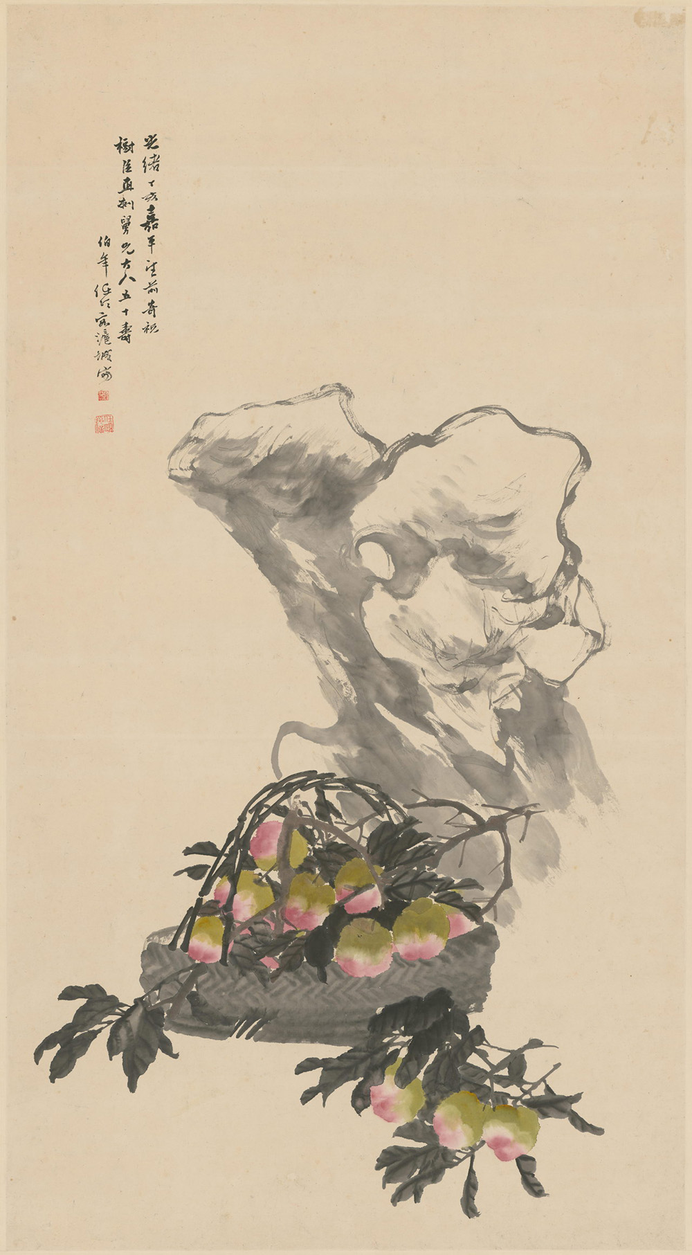 图绘一篮鲜桃和方硬的顽石。桃和石以具有长寿的吉祥寓意而成为人们喜闻乐见的祝寿画题材。款署:“光绪丁亥嘉平望前,奇祝树臣直刺舅兄大人五十寿,伯年任颐客沪城写。”钤“伯年大利”朱文印、“任颐印信”朱文印。