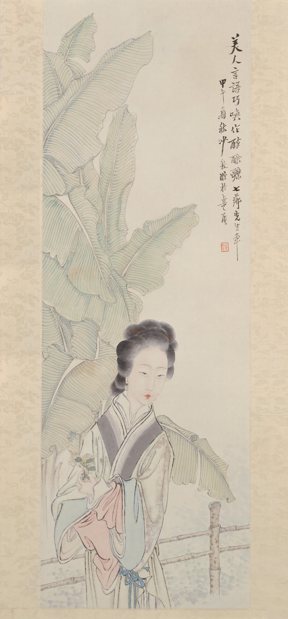 此幅是作者仿改琦笔意创作的写意仕女画。图绘女子手持花枝立于芭蕉树前闻香自醉的仪态风情。其高耸的发髻先以浓淡墨反复晕染,然后以重墨绘出根根发丝,线与面结合的绘画技法显现出女子头发的浓密及发质的柔顺。仕女的面形为瓜子脸,面部以不着痕迹的浅红色晕染,突出了人物肌肤光滑细嫩的质感和五官结构的明暗变化。其眉目间流露出矜持凄凉的怨情,与晚清文人画家在仕女画创作上所追求的“清淑静逸”之趣相符,具有鲜明的时代特征。自题:“美人言语巧唤作醉酴醿,七芗先生本。甲午菊秋沙馥临于粟庵。”下钤“山春所作”印。甲午为清光绪二十年(1894年)。