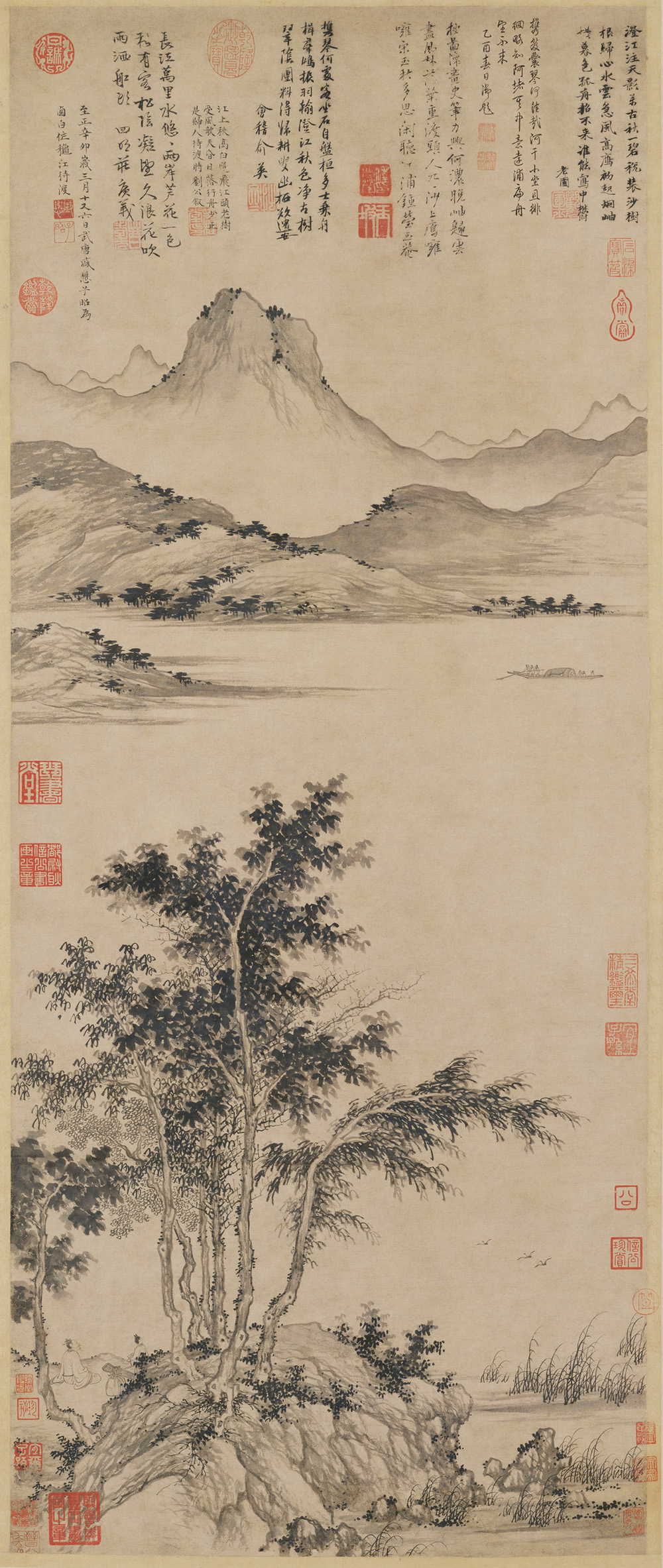 款识:至正辛卯岁(1351年)三月十又六日,武唐盛懋子昭为卤西作秋江待渡。
