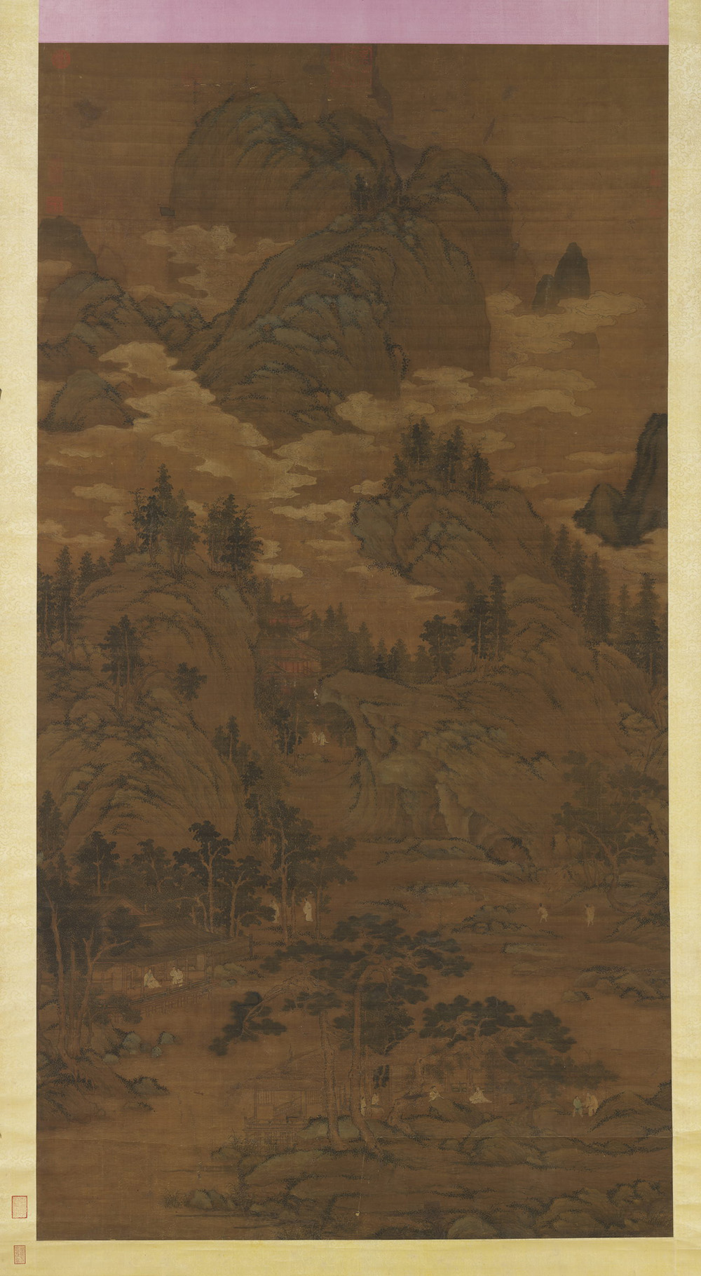 巨幅绘沿溪两岸,松林掩映,枝叶条畅,水阁亭榭间,文人雅士悠闲的倚坐休憩,或驻足交谈。远山苍润,苔点茂密,山际白云萦回缭绕,烘托出一幅清朗怡人的夏日山景,然用笔稍弱,恐属盛懋一系画家之作。