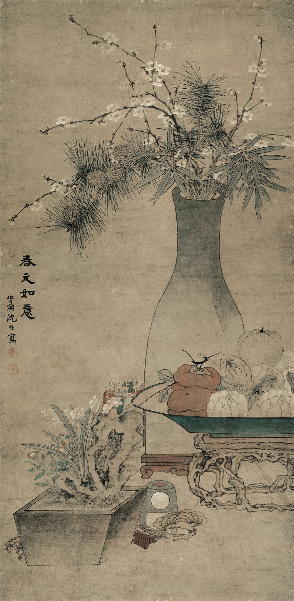 图上题有春元如意四字。这是一幅典型的庆贺正月新年的岁朝图,春元即正月初一。此类题材历代画家特别是文人画家都喜欢创作,并作为新年伊始的开笔之作。主要描绘冬季花卉,如腊梅、松柏、水仙等富有吉祥寓意的花草,一并搭配冬天不易看到的花卉、草木、果实等,意味着春天即将来临,以增加节日的祥和气氛。沈焕以工笔画画出瓶插岁寒三友:松、竹、梅。梅花正吐出幽香,枝桠纵横,作为主花。瓶边设有果盆,摆着香橼、佛手、百合、柿子;一旁是仙盆,种有水仙花,缀以金盏花、寿石。瓶盆边还有一柄古色古香的树根雕如意、一捆红红绿绿的爆竹,一枚鸽哨。岁寒三友高洁、迎春,结子的松枝也含有多子嗣之义。百合、柿子加如意为百事如意,水仙寿石为群仙祝寿,爆竹也是报春之意。鸽哨子(也叫做鸽铃、空钟)则是祝青云万里之意。种种吉祥语言从画中散发出来。有宫廷花的繁复。
