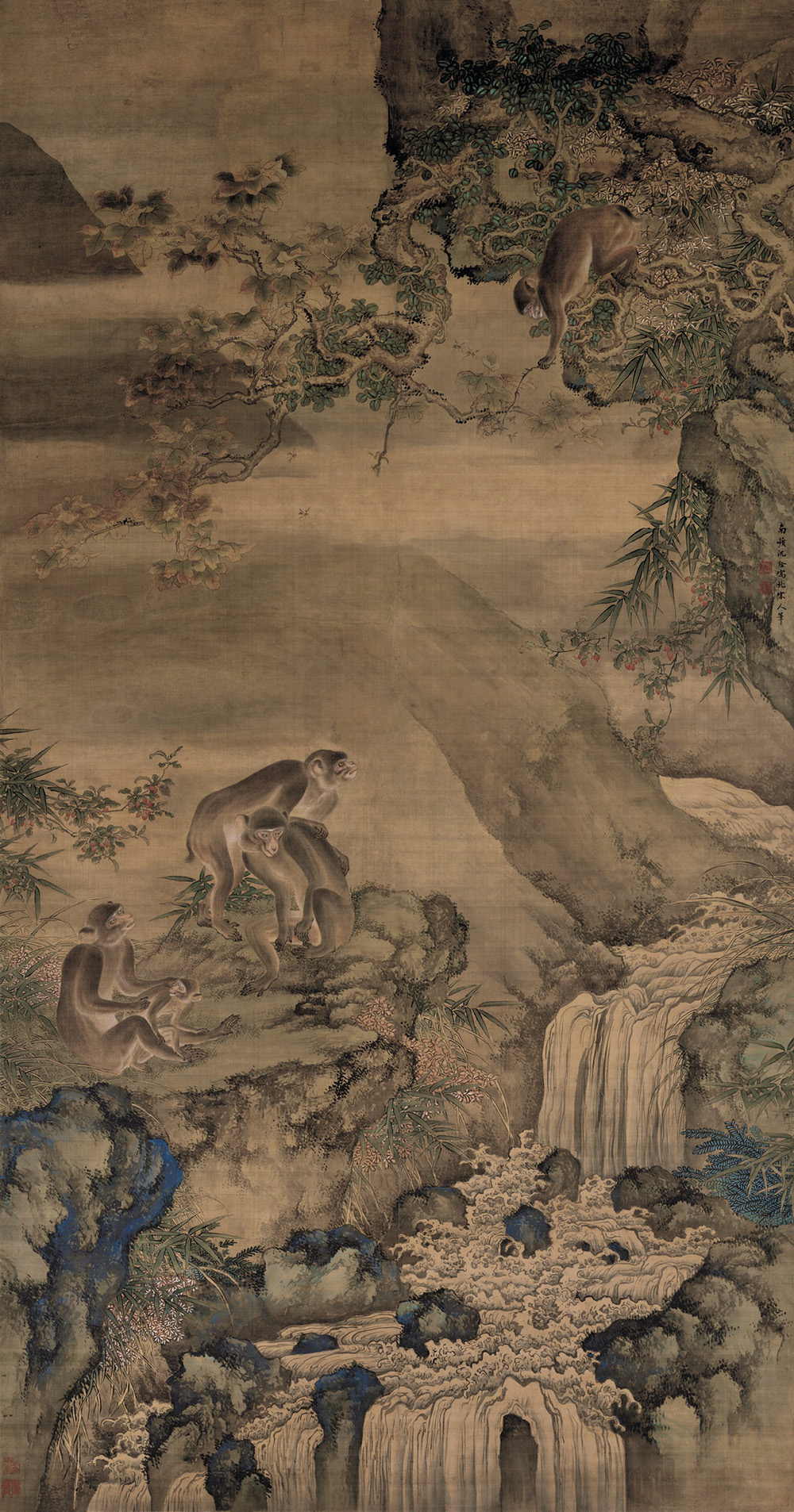此图绘蜂和猴,寓意“封侯”,是一幅恭祝高升的图画。图绘深山中,几只猴子在树林小憩,一只调皮的猴子爬到树上,拿着小树枝认真的在捅马蜂窝。全图敷以重色,绘树叶繁茂,果实鲜艳;猿猴仿易元吉笔法,活泼生动。