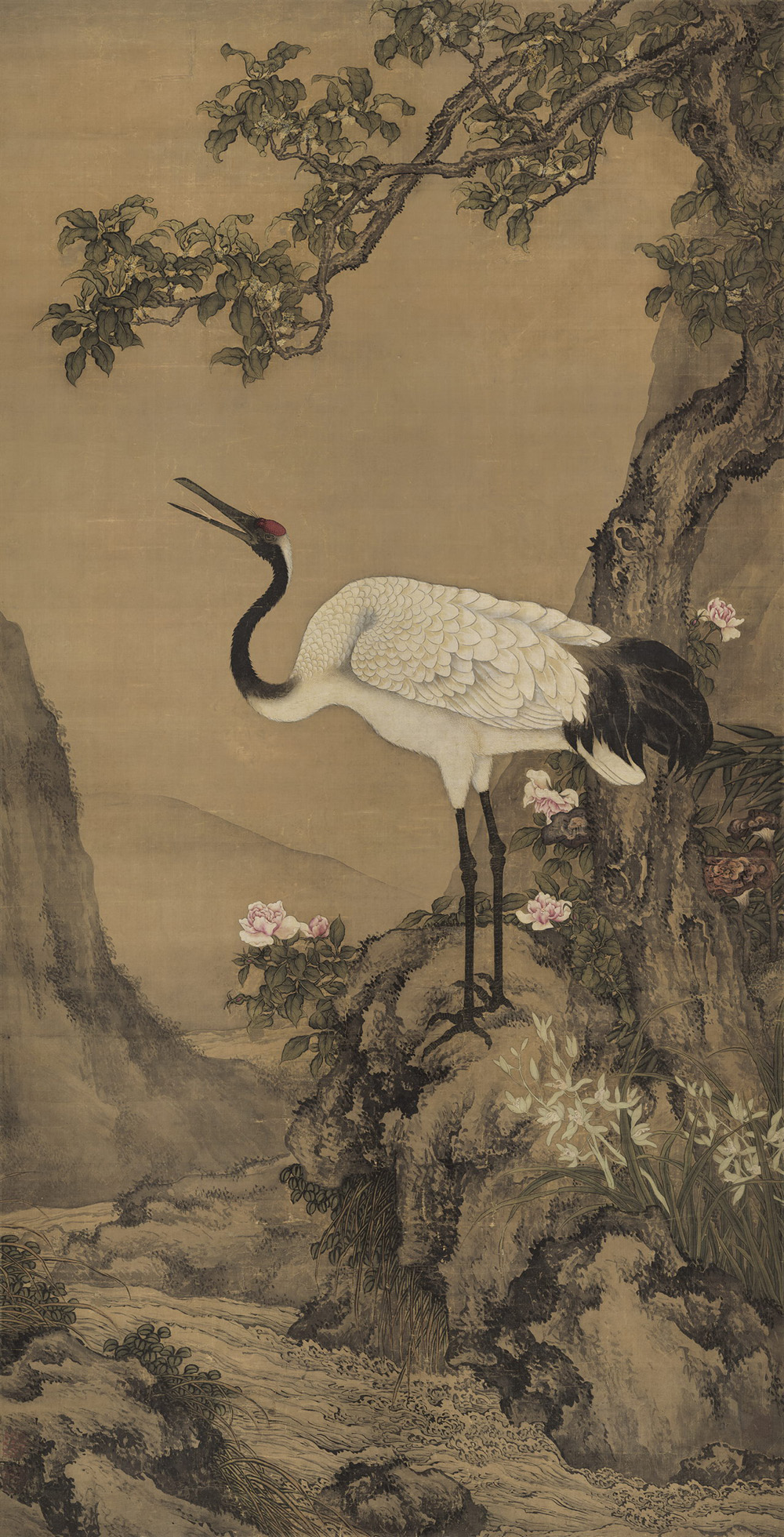 此幅是祝寿图,寓意鹤寿延年。绘一棵桂树,树杆粗壮,二枝树枝倾斜入画,花缀枝头,金色小花穿插于浓密的树叶中;一只白鹤立于湖石上,张开的喙似在呼朋引伴;地面鲜花绽放,处处洋溢着喜悦的气氛。作者印:沈铨之印、南萍氏。家住召南余不溪。