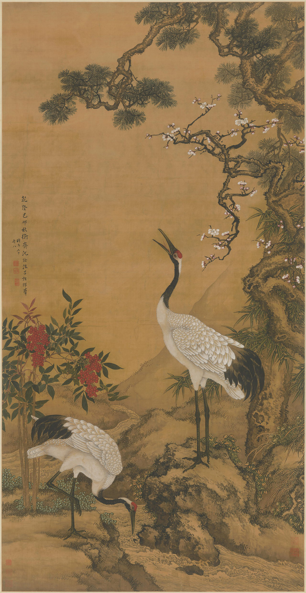 左侧自题云:“乾隆己卯秋衡斋沈铨法吕指挥摹。时年七十有八。”钤“沈铨”、“衡斋”、“衡之”印。图右绘梅花老松,虬枝盘曲,树下两只白鹤挺立。图左又绘一丛南天竹,红果连缀其上。