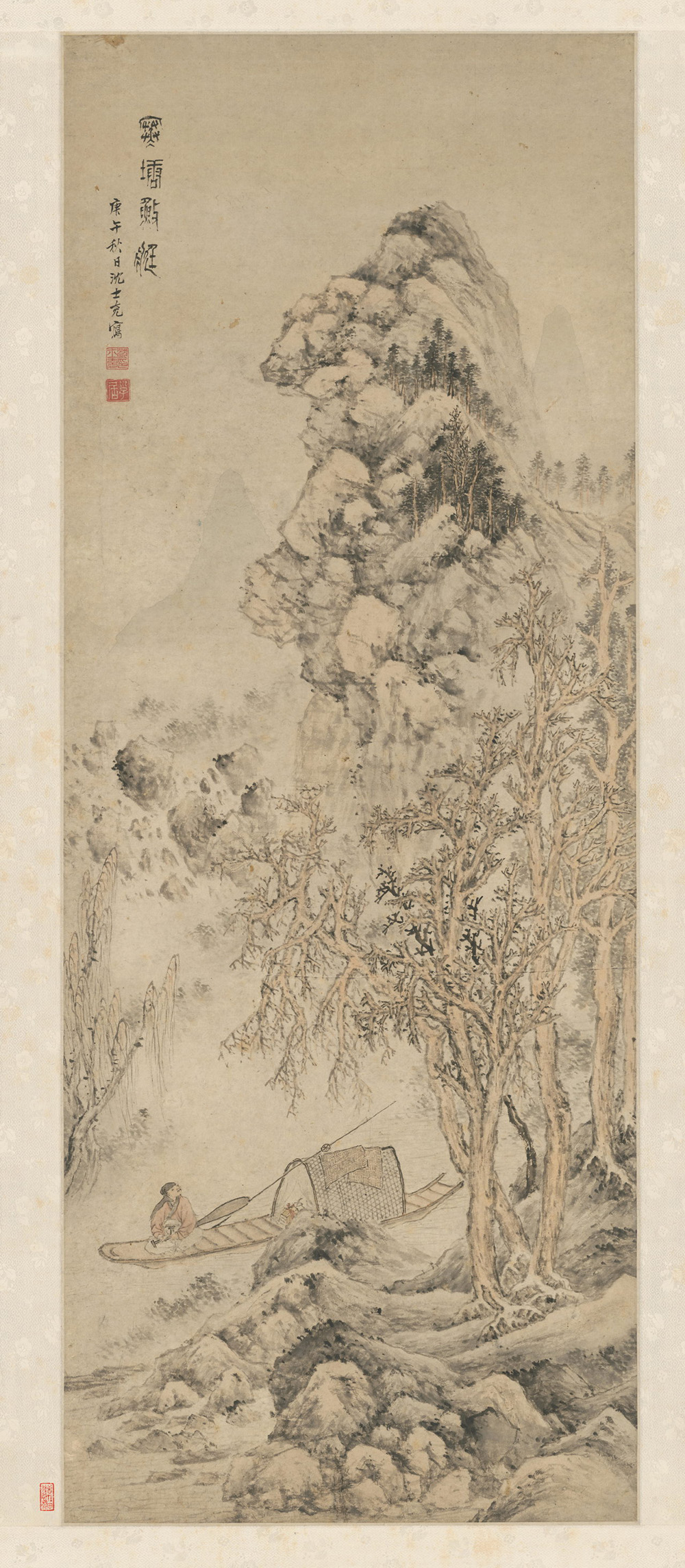 图中画深壑幽谷中木叶尽脱,枯树槎桠交错,一位隐士驾舟穿行于湖上,舟中满载诗书、酒瓯,船篷上放着钓竿,隐士正停橈远眺。用笔多干毫枯墨,水分很少,赋色以浅绛为主,突出了山石树木的萧瑟之气,表现了沈士充晚年淡设色山水的典型风格。本幅篆书自题:“寒塘渔艇”,并识“庚午秋日沈士充写”。钤“沈士充印”、“子居”印。“庚午”为明崇祯三年(1630年)。左裱边钤鉴藏印“曾在田桂舫处”。