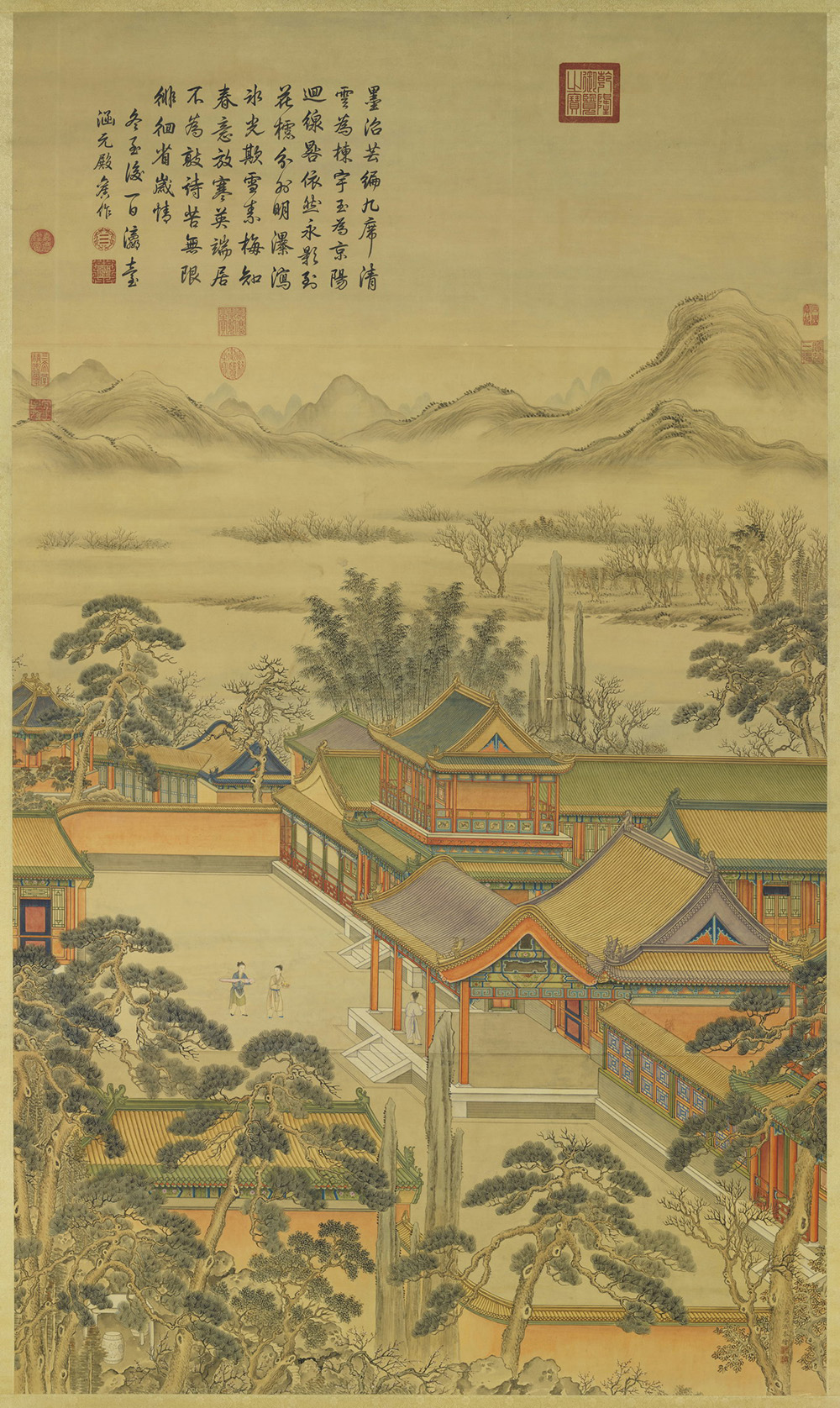 《十二禁禦景图》轴由清乾隆时期丁观鹏、余省、沈源、周鲲四位画家合绘。这十二幅画的主题依据乾隆帝御制十二月诗诗意作画,每人三幅,又以十二律命题。画作表现除诗意所着重的时序外,更凸显出诗中相关活动的宫苑景致所在。
