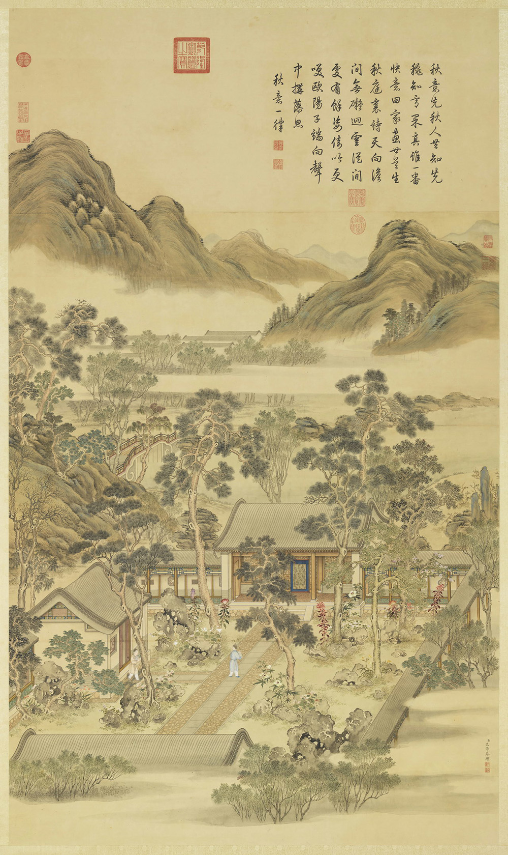 描绘乾隆十二年前后,圆明园勤政亲贤生秋庭农历七月风貌。清高宗题跋:秋意先秋人共知。先秋知意果真誰。一番快意田家畫。廿首生秋庭裏詩。天向澹間無礙迴。雲從間處有餘姿。倚吟更笑歐陽子。端向聲中構藻思。秋意一律。