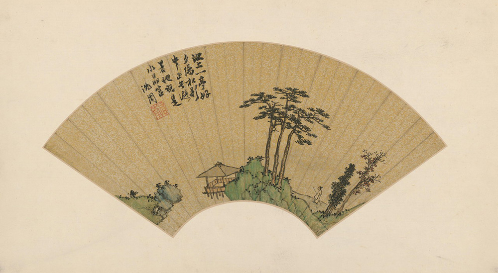 此图是幅笔笔紧贴诗意的画作。图绘夕阳下,高士策杖至江亭避暑的小景。扇面构图为左右开合式,设色以绿色为主,其青翠明洁的色调与简约的景致相呼应。清爽、平淡的审美意趣与消除烦躁求得清凉的避暑主题相契合,烘托出远离市俗寻幽独行高士其清逸雅淡的心境。