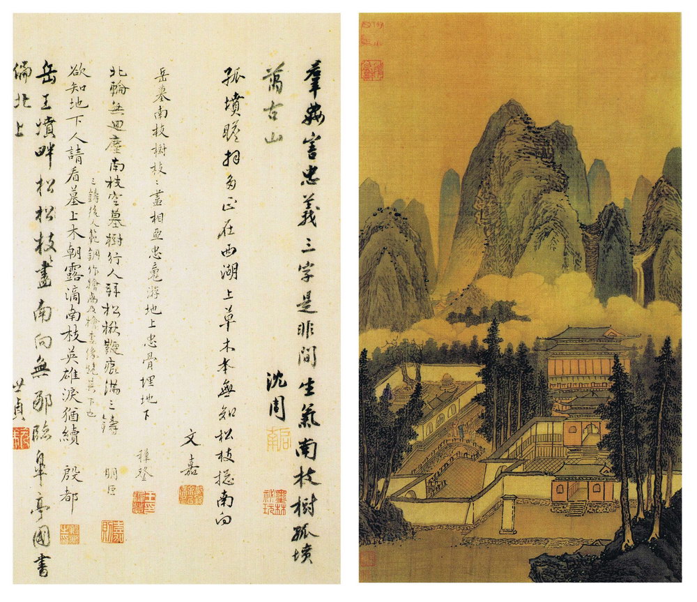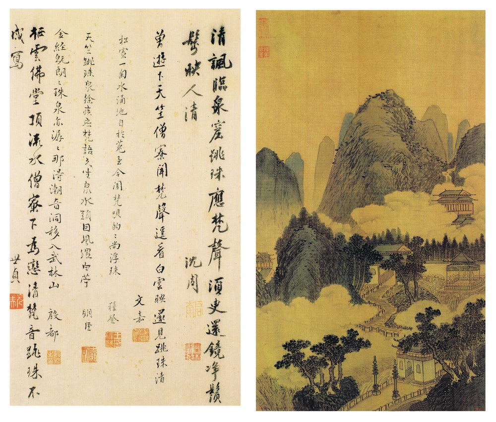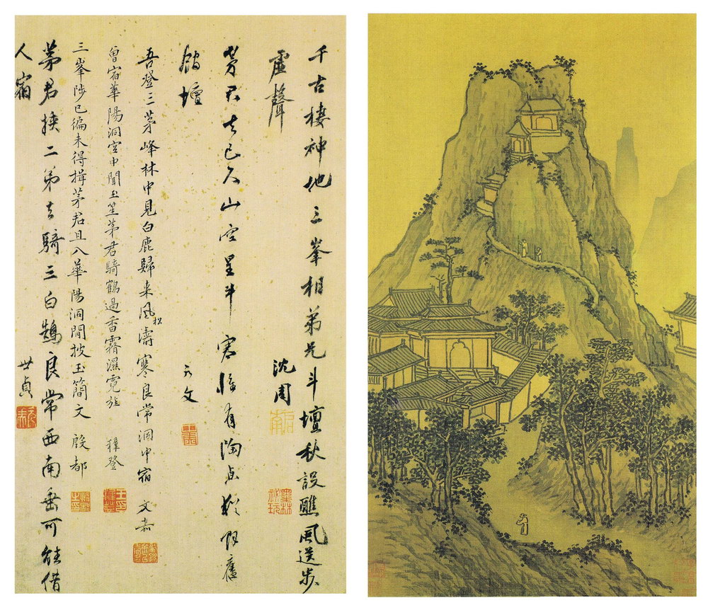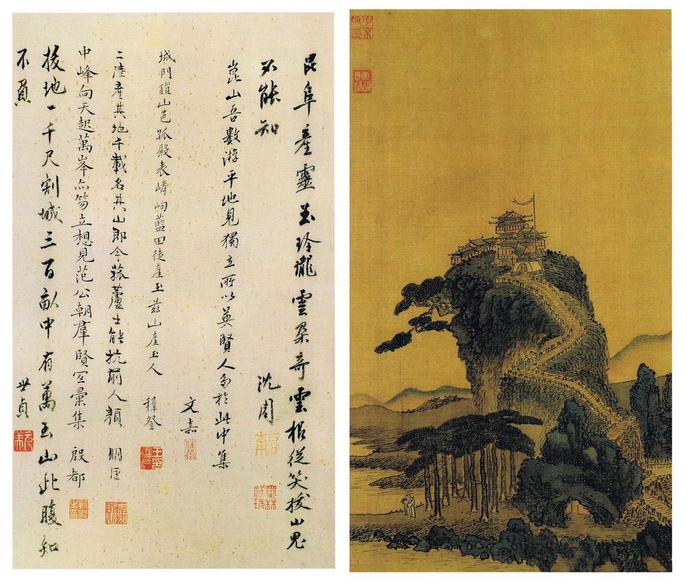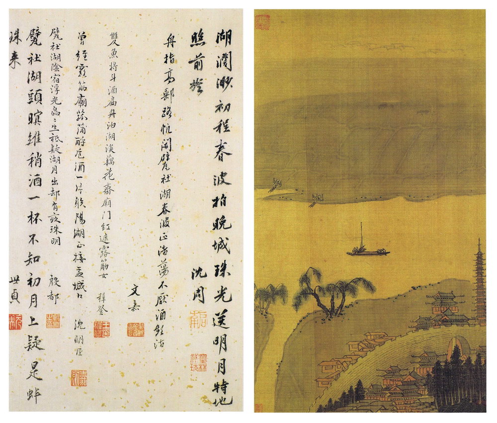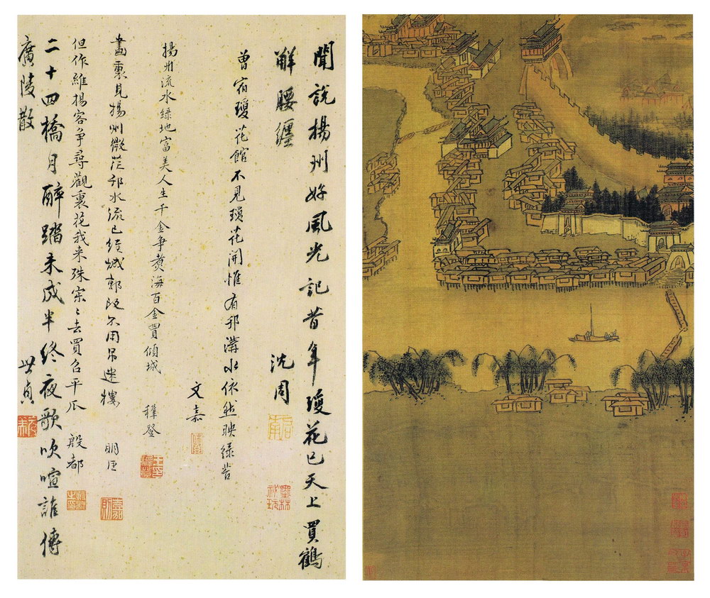 描绘长江淮河两岸名胜风景的册页,共十幅,每幅对页有沈周自题七绝一首,并有友人文嘉、王穉登等人题和诗。画面皆剪裁简明,情景融合,却构成诗意盎然的境界。用笔质朴、凝重,山峦的 繁笔勾皴和屋宇的简笔勾勒,形成疏密的对比,墨色也富有虚实轻重的变化,使画面产生强烈的装饰美感。