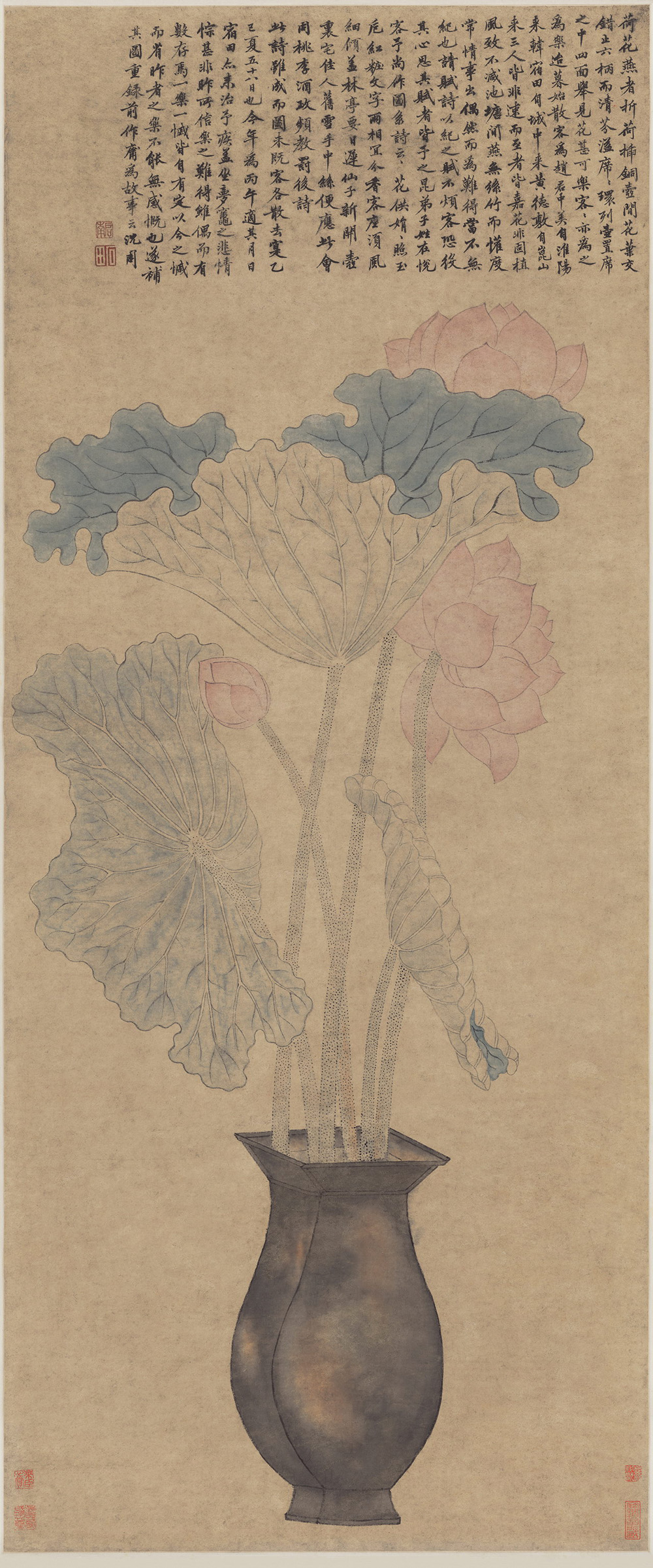 沈周作品中比较少见的工笔花鸟画,画上绘一铜壶,内植荷花荷叶各三株,交错而生。荷叶向背以深浅不同绿色区分,多取其背,使画面变浓艳为淡雅,凸现清高风格。作品形象写实,用笔简括,色泽温润,格调质朴。插花所用的铜壶以墨笔勾轮廓,没骨法渲染明暗,立体感很强。