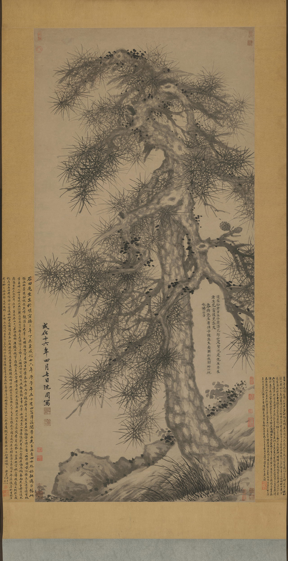 笔墨简逸而又沉着,物象写实而又生动,画法兼具写生、写意之妙,诚如王世贞所评:”石田氏乃能以浅色淡墨作之,而神采更自翩翩,所谓妙而真也。”本图小楷自题:”从来松老方生子老得儿郎必定贤,况是先生年未老,生儿当后见参天。春雨先生有佳子后生久矣.”款识:成化十六年(1480年)四月七日沈周写。