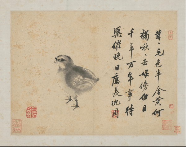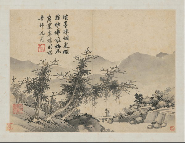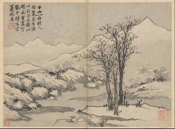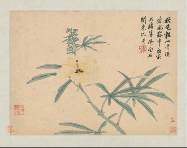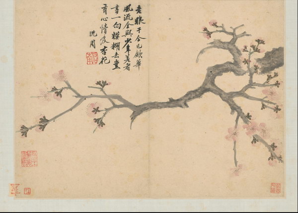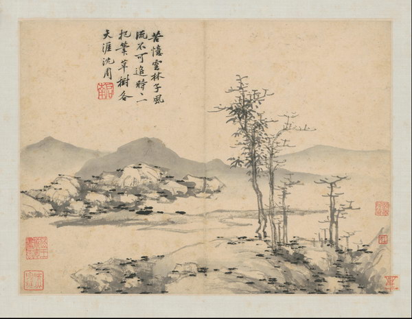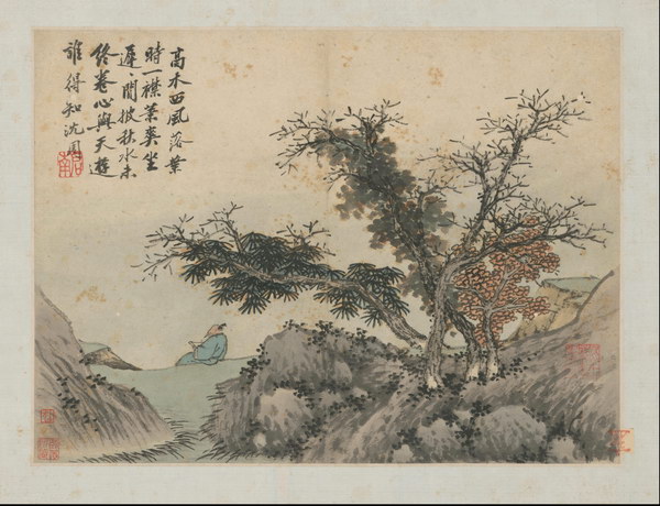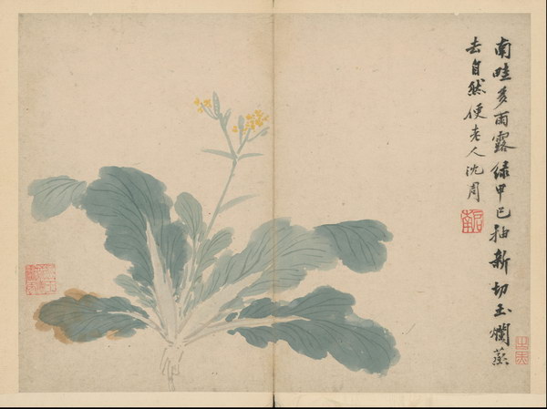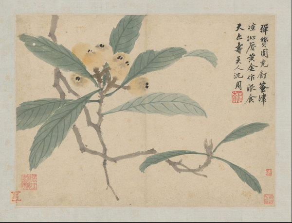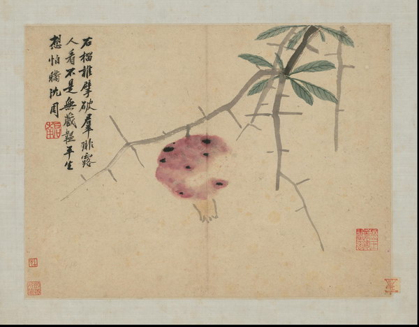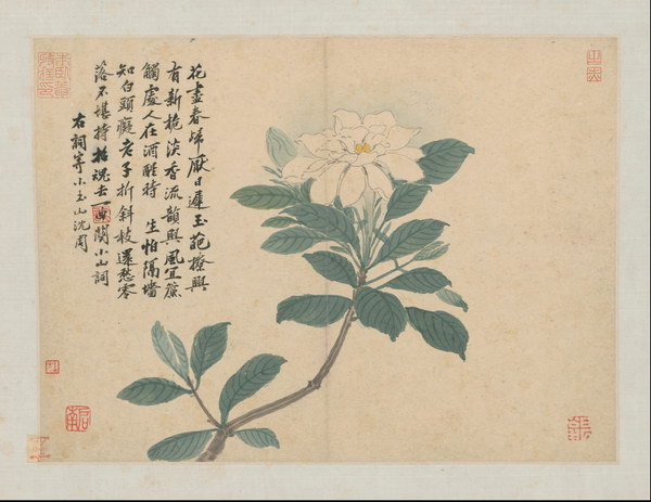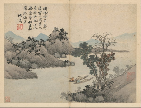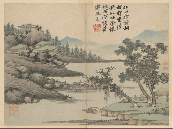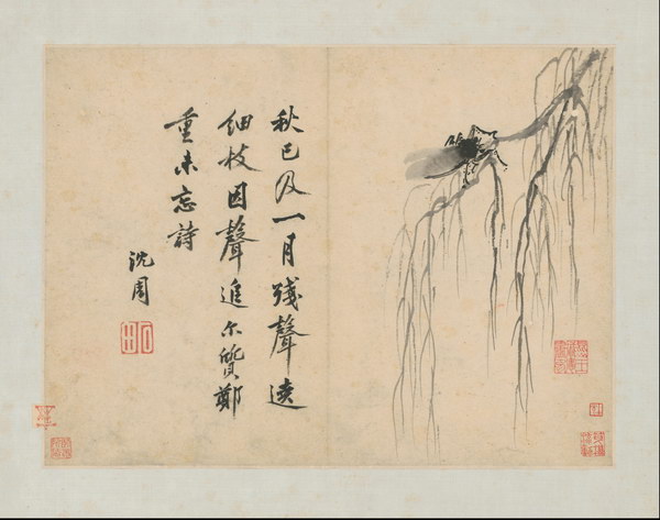 首开自书“卧游”,钤朱文“沈氏启南”印,其后分别绘石榴、平坡散牧、栀子花、山水小景、秋山读书、枇杷、雏鸡、芙蓉、仿倪山水、梅花、杏花、秋柳鸣蝉、江山坐话、白菜、江山垂钓、仿米山水、雪江渔夫等山水、花鸟小景。每幅画中均有画家自题,结合画面物象抒发其内心感受。落款后钤朱文“启南”、白文“石田”或白文“石田翁” 等印。