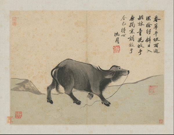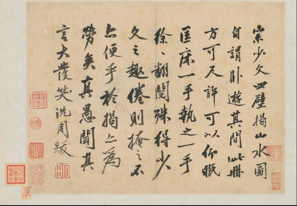 根据末开画家自题,可知该册页的“卧游”之名源自南朝宋宗炳在居室四壁挂山水以卧游的典故。然而不同于挂轴的是,该图册还可于卧床时仰面翻阅。 由此可见画家的绘制初衷和生活情趣。