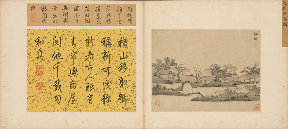 钤朱文“启南”一印,右上隶书“新郭”二字,本幅“仪周鉴赏”收藏印一方。对幅陈淳楷书诗一首。
