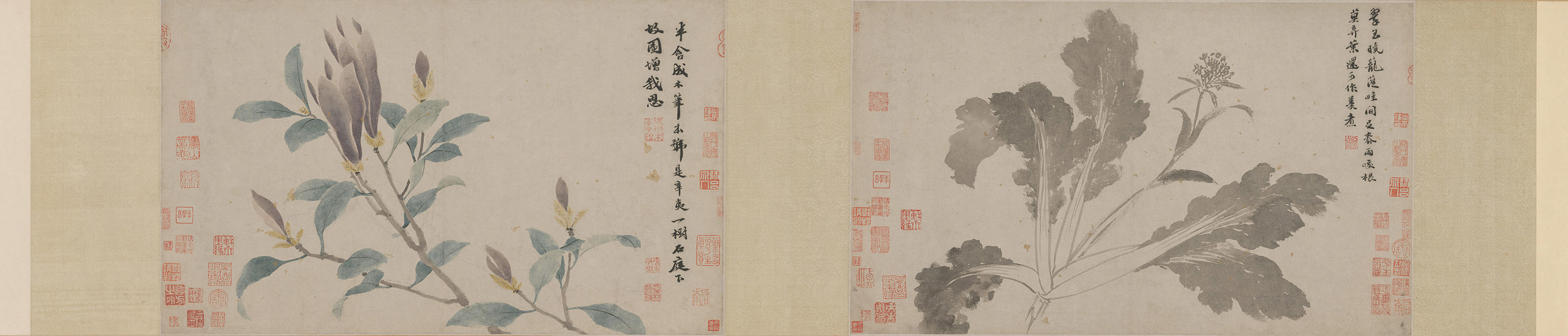 第一段:本幅无款,右下钤印“启南”(朱文)。另有吴宽题诗:“半含成木笔,本号是辛夷。一树石庭下,故园增我思。”钤印“延州来季子后”(朱文)。另钤“项元汴印”(朱文)等鉴藏印多方。此幅采用没骨法绘折枝辛夷,以苍秀古拙之笔画花卉枝干,以不同水分的色墨画出花瓣叶片,色泽浓淡分明,层次丰富,再用重墨劲细之笔勾画叶筋。构图疏密有致,设色清妍秀雅,富于蕴蓄之致。