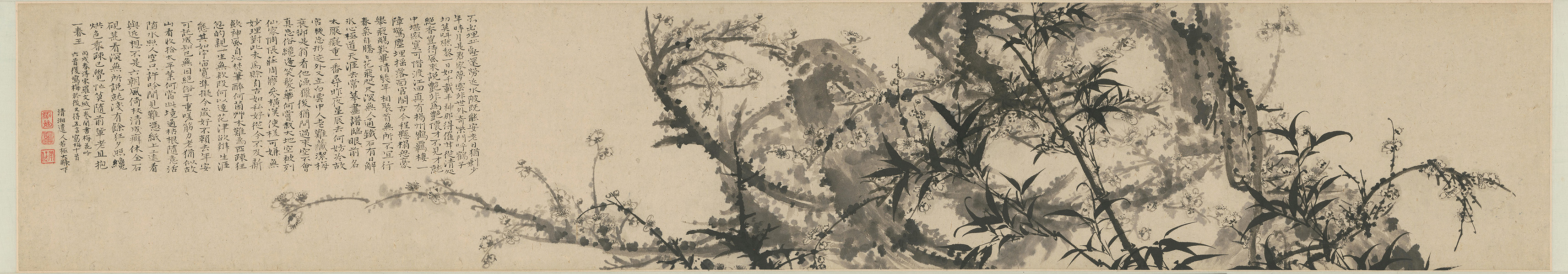 据作者款题而知,此图使用的是宋代罗文纸,作者先在纸上题诗,而后再补绘梅竹与诗文相映衬。诗文与画作的有机结合不仅增添了文人画的书卷气息,同时也展示了作者于画艺之外的诗文功底和精湛的书法造诣。图中所绘梅竹或细笔勾勒,或阔笔勾斫,线条于方圆结合中秀拙相生。其多样的笔法与酣畅淋漓的施墨在半生半熟的纸质上达到了湿润而不漫漶的笔墨效果,堪称石涛晚年的写意画佳作。