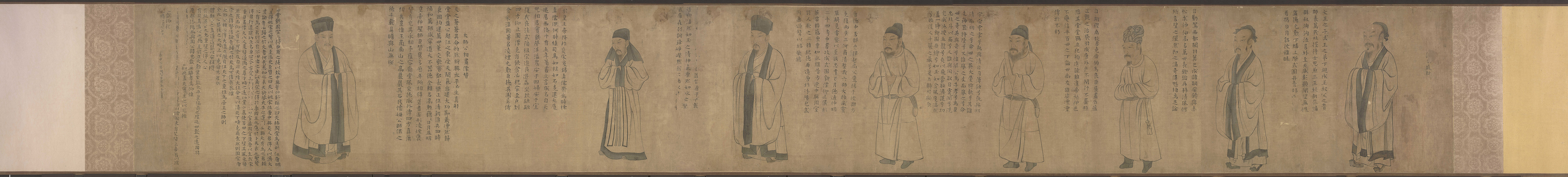 《八相图》绘不同朝代的八位贤臣像,从右至左分别是:周公姬旦、汉留侯张良、唐郑国公魏征、唐 梁国公狄仁杰、唐汾阳郡王郭子仪、北宋名将韩琦、北宋大史学家司马光、南宋名相周必大。每位贤臣立像后书颂文一段,但第八位周必大的颂文在像前。尾纸有题 记,可惜的是几处有关人物与时间的文字残缺不辨。