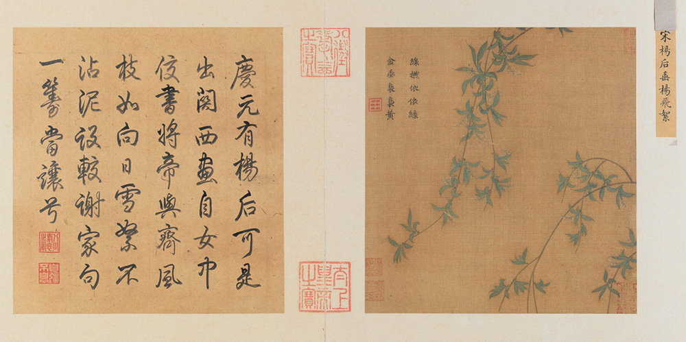 本幅无款。钤“墨林秘玩”、“项子京家珍藏”、“项元汴印”、“神品”等鉴藏印4方。对幅有清乾隆皇帝御题诗一首:“庆元有杨后,可是出关西。画自女中佼,书将帝与齐。风枝如向日,雪絮不沾泥。设较谢家句,一筹当让亏。”钤“太上皇帝之宝”、“八徵耄念之宝”、“自强不息”等印。
