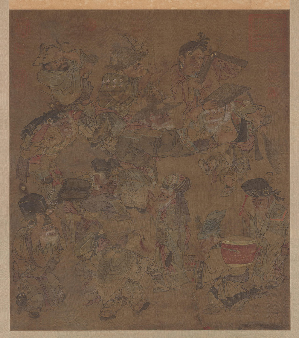 此画面上共画有十二个人。他们都穿着奇异的服装,戴着各式的帽子和插着花枝。帽子的式样毫不重复,除了斗笠、巾和冠之外,有的是戴着粗角的兽头,有的是农家场院器具斗、箩、箕之属。他们的手中或身上携拿着鼓、铃、檀板等乐器,或为扇、篓、帚等用具,或为花枝、瓜之属。所有人的面部都化了妆,可能戴的是假面具。十二个人团团围住,手舞足蹈,充满着欢乐的气氛。旧题《大傩图》。